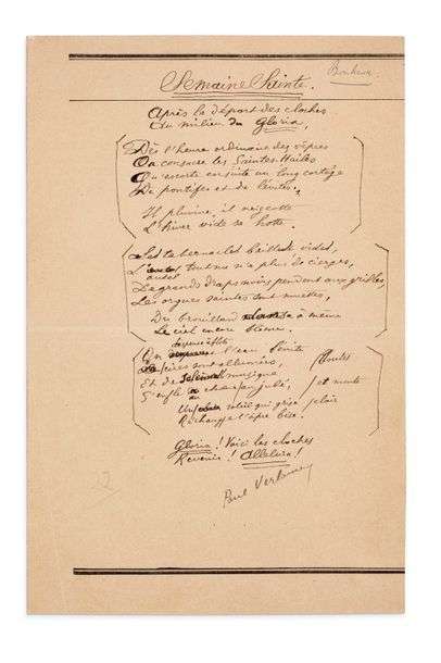 Poème aut. signé. «Semaine Sainte.» S.l.n.d. (1891). 1 p. in-8 sur feuillet de l'Assistance publique, ratures et corrections.
