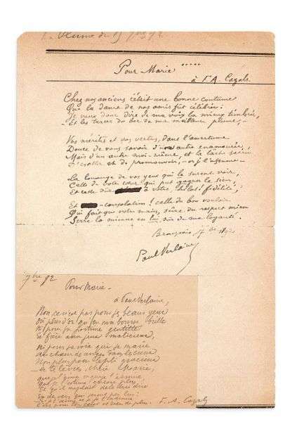 Brouillon d'un poème intitulé «Pour Marie» et dédié à son ami François-Auguste Cazals. Ce poème paraîtra dans La Plume le 1er octobre 1892.