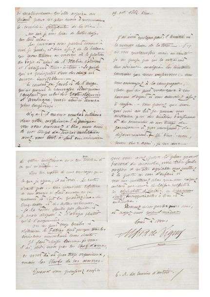 Lettre profondément pessimiste et chargée d'émotion dans laquelle Alfred de Vigny, atteint par la maladie qui l'emportera, mesure l'importance de l'amitié, évoque longuement sa jeunesse, révèle sa fascination pour Bouddha et son souhait de détruire ses oeuvres de jeunesse. J'ai écrit quelque part: l'amitié est la seconde chose de la terre. J'y ai cru quelquefois mais en vérité je ne pense pas que la vôtre soit bien sérieuse malgré les lointains souvenirs que nous conservons. Vous vous ennuyez à la campagne chose qui ne peut manquer à un homme d'esprit (...) Vous pensez que moi qui suit au lit je pourrai vous distraire par des histoires parisiennes et des souvenirs de nos temps de garnison et, par conséquent, de désoeuvrement. Eh! bien! non! mon cher ami, je ne me reporterai pas aujourd'hui à cette époque engourdie qui aurait paralysé ma première jeunesse sans deux choses qui possédaient mon âme: un premier amour insensé et profond pour cette belle et jeune personne dont le nom et la figure ressemblaient au nom et aux traits des anges, cette passion de mes dix-huit ans qui me charmait jusqu'au jour où elle me désespéra et, sans une sorte de passion de l'Esprit qui dure encore, plus persévérante et plus ardente que jamais, l'Etude. L'Etude incessante, l'Etude de toute chose, l'Etude acharnée, inexorable me suit et me poursuit et je lui obéis parce qu'elle m'a toujours servi à oublier. Elle absorbe toutes mes émotions et les impressions d'ennui ou de chagrin que la journée vous a apportées. Elle m'ouvre les portes du monde Idéal et m'y retient. Hier par exemple, j'étais ravi par l'étude que je me plais à faire des beautés de la Poésie Indienne et de ses extases dans un monde merveilleux et philosophique. La plus singulière, la plus mélancolique des Religions, celle de Bouddha est aujourd'hui celle de quatre cents millions d'hommes. Elle a été le Protestantisme de Brahma
