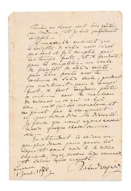 Curieuse lettre à propos de la commande d'une nouvelle toilette en satin noir, auprès d'un couple de tailleurs installés à Milan, Charlotte Challion et son mari Gaetano Ghezzi. Ses effets lui sont arrivés seulement hier soir| ce retard l'a beaucoup contrarié, craignant que le St-Gothard ne soit fermé avant leur envoi. En attendant je voulais vous seulement rassurer par ces quelques lignes de la réception finale de tout en bon ordre| je vous dis maintenant mes louanges les plus sincères! vous avez très bien compris ce que je désirais| et je vois qu'on peut bien se fier à votre complaisance comme à votre goût! Toutes ces choses sont très goutées par Madame, et je suis parfaitement satisfait. Il nous semble seulement que la toilette de satin noir n'est pas tout à fait complète pour les temps froids, et il faudrait la compléter - une sorte de paletot de satin ouaté pour être porté avec le costume de satin seule, pendant que maintenant (pour le temps froid) il faudrait porter ce costume avec le manteau de velours - ce qui va très bien, mais qui est monotone (...).