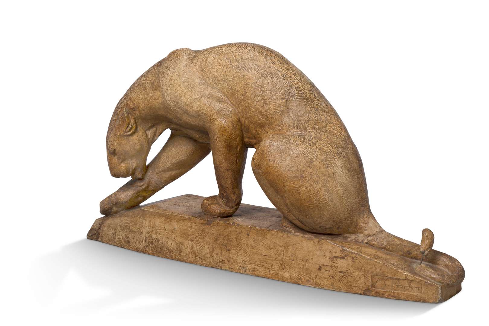 - Maurice Prost (1894-1932), Panthère se léchant, 1932, terre cuite patinée, 28 x 57 x 11 cm, Brunoy, Musée municipal Robert Dubois-Corneau, Inv.2003.18.S (queue et terrasse avec variantes)~