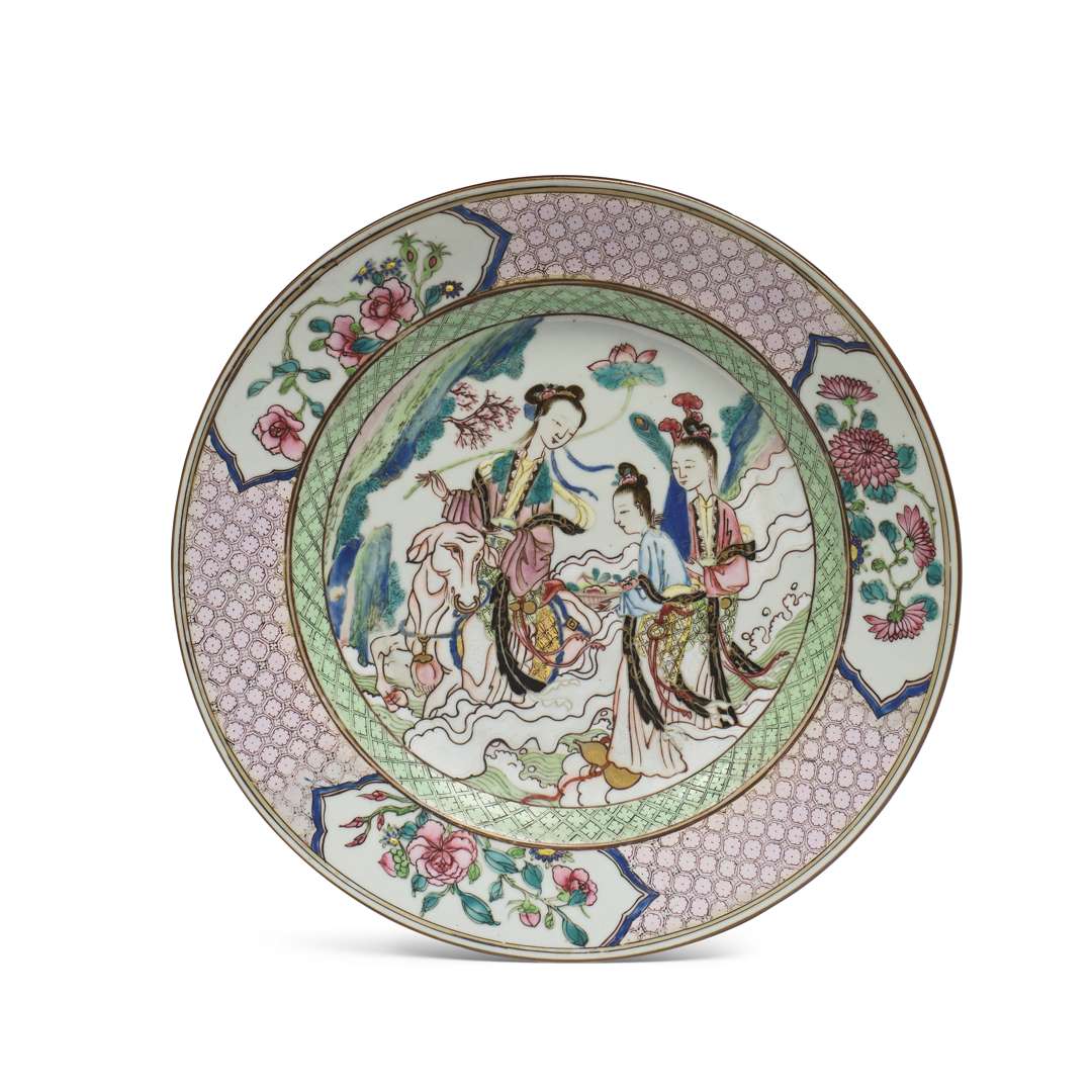 Assiette en porcelaine aux émaux de la famille rose figurant l'immortelle taoïste He Xianggu chevauchant un buffle, accompagnée de deux attendantes portant des présents. L'aile avec des réserves abritant des fleurs alternant avec une résille géométriques.