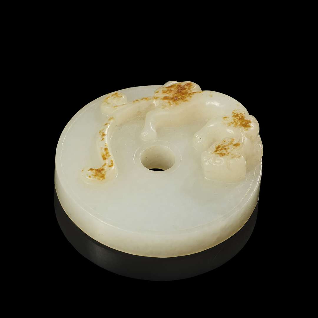 Petit disque Bi en jade blanc sculpté à décor d'un chilong tournoyant. Le revers sculpté de pastilles. La pierre avec des inclusions rouille.