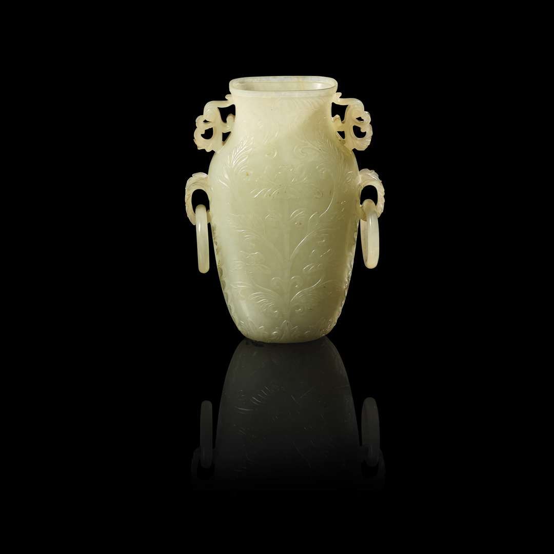 Petit vase balustre en jade céladon sculpté de style moghol, le corps orné de tiges et de fleurs stylisées se déployant symétriquement. L'épaule soulignée de deux anses imitant la forme de feuilles dentelées et tenant des anneaux mobiles. Le col flanqué de deux rinceaux sculptés.