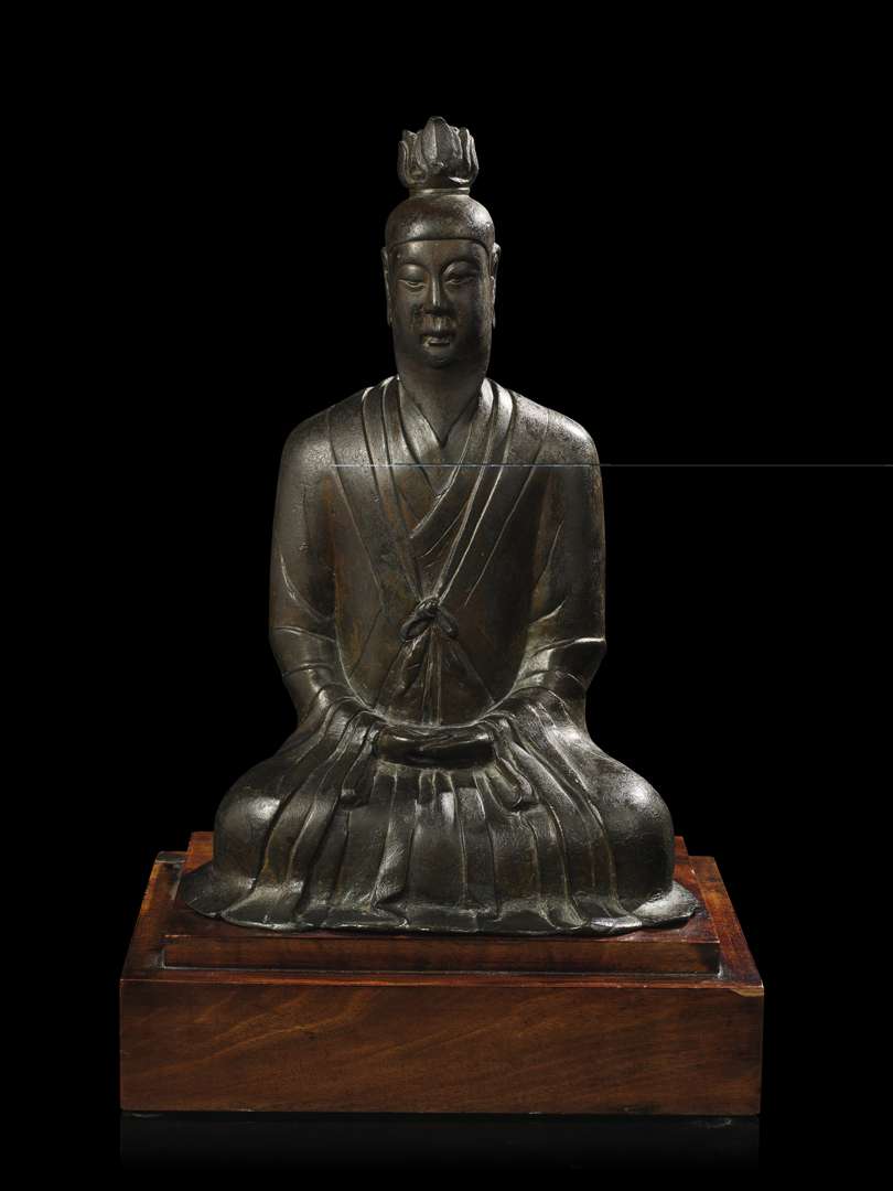 Rare et importante statue de divinité taoïste en bronze, figuré assis en position de méditation, les mains reposant l'une sur l'autre au creux des jambes, vêtu d'un robe et d'un long manteau aux plis simplifiés. Le visage à l'expression sereine est encadré par une longue et large barbe stylisée. La chevelure ramenée en chignon est enserrée dans une fleur de lotus. Socle en bois postérieur.