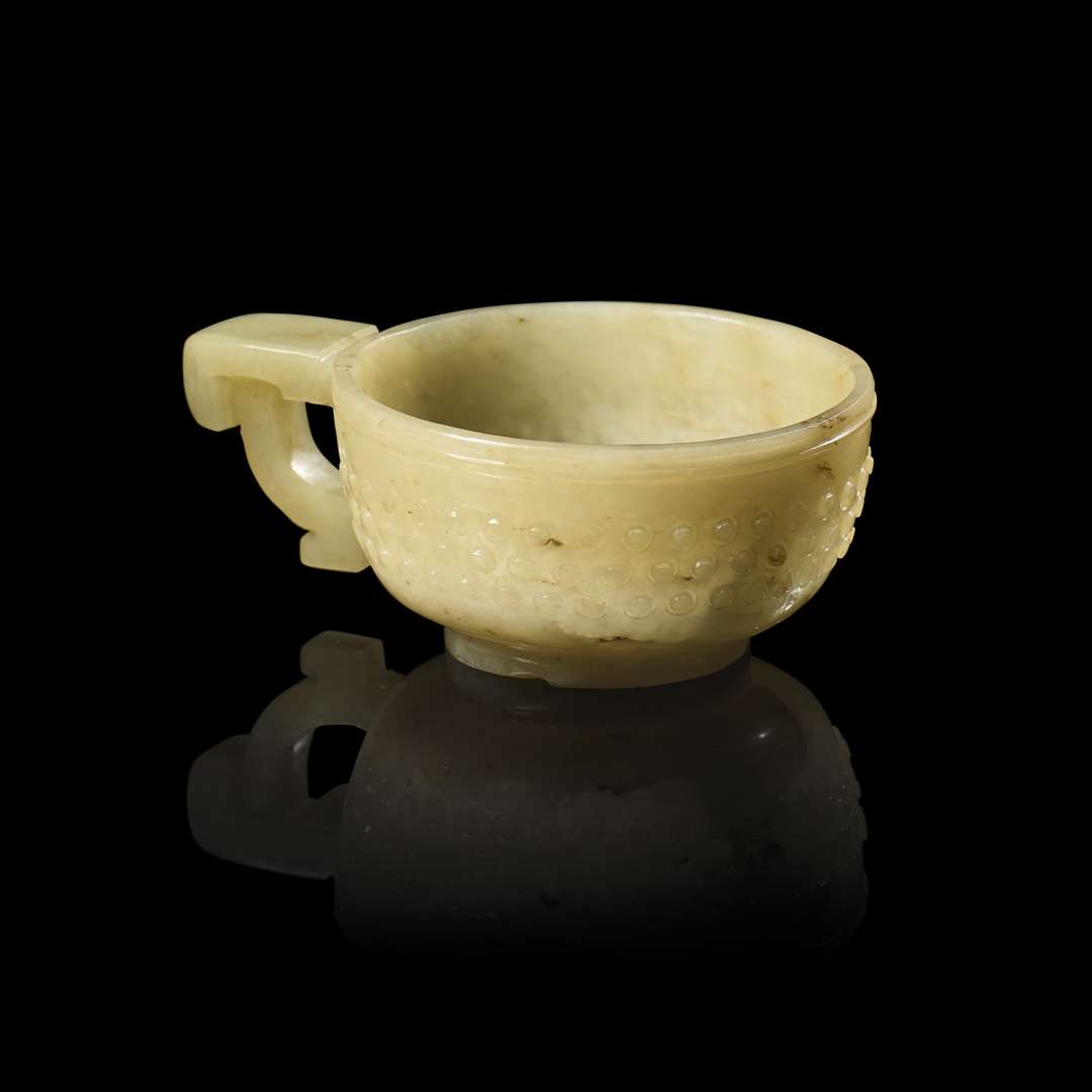 Coupe libatoire Yi en jade céladon sculpté de style archaïsant à décor de trois rangées de pastilles.