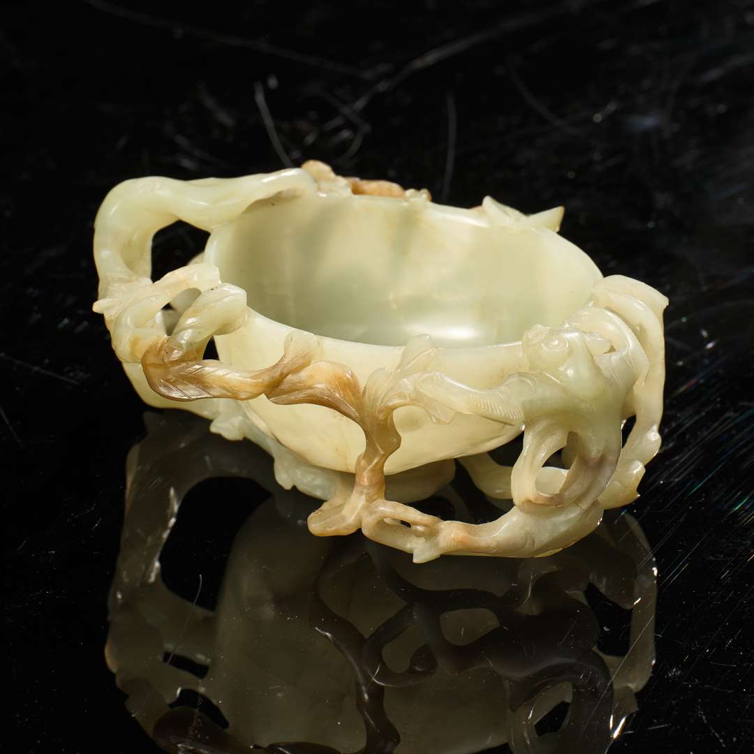 Rince-pinceaux en jade céladon pâle sculpté, la partie centrale entourée de branches noueuses feuillagées et d'un chilong s'appuyant sur la lèvre.