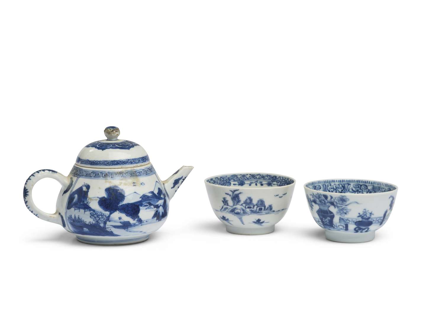 Petite théière couverte en porcelaine bleu-blanc décorée d'un paysage lacustre.