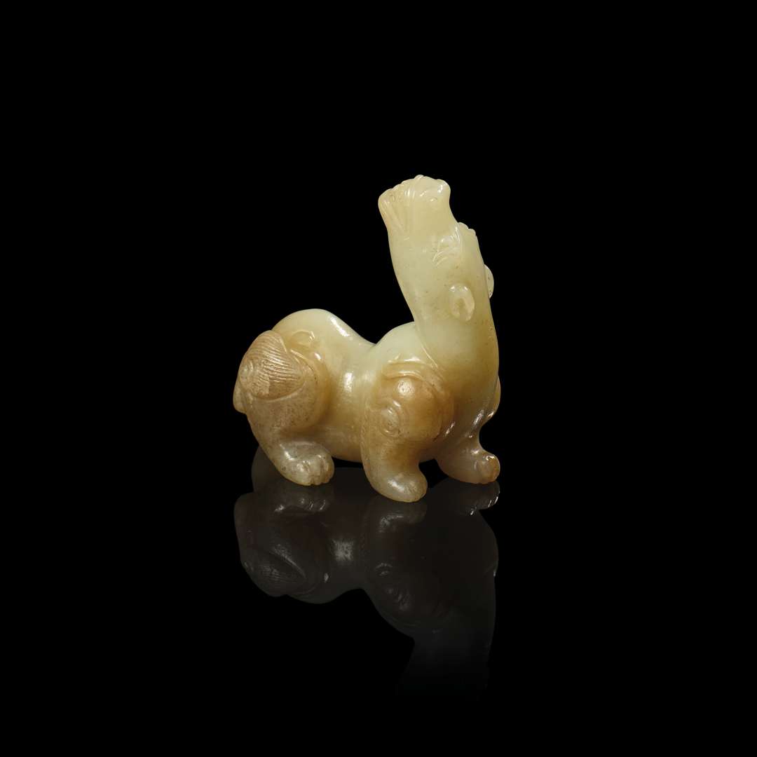 Jade céladon pâle sculpté figurant un bixie, la tête relevée et tournée vers l'arrière. La pierre avec des inclusions brunes.