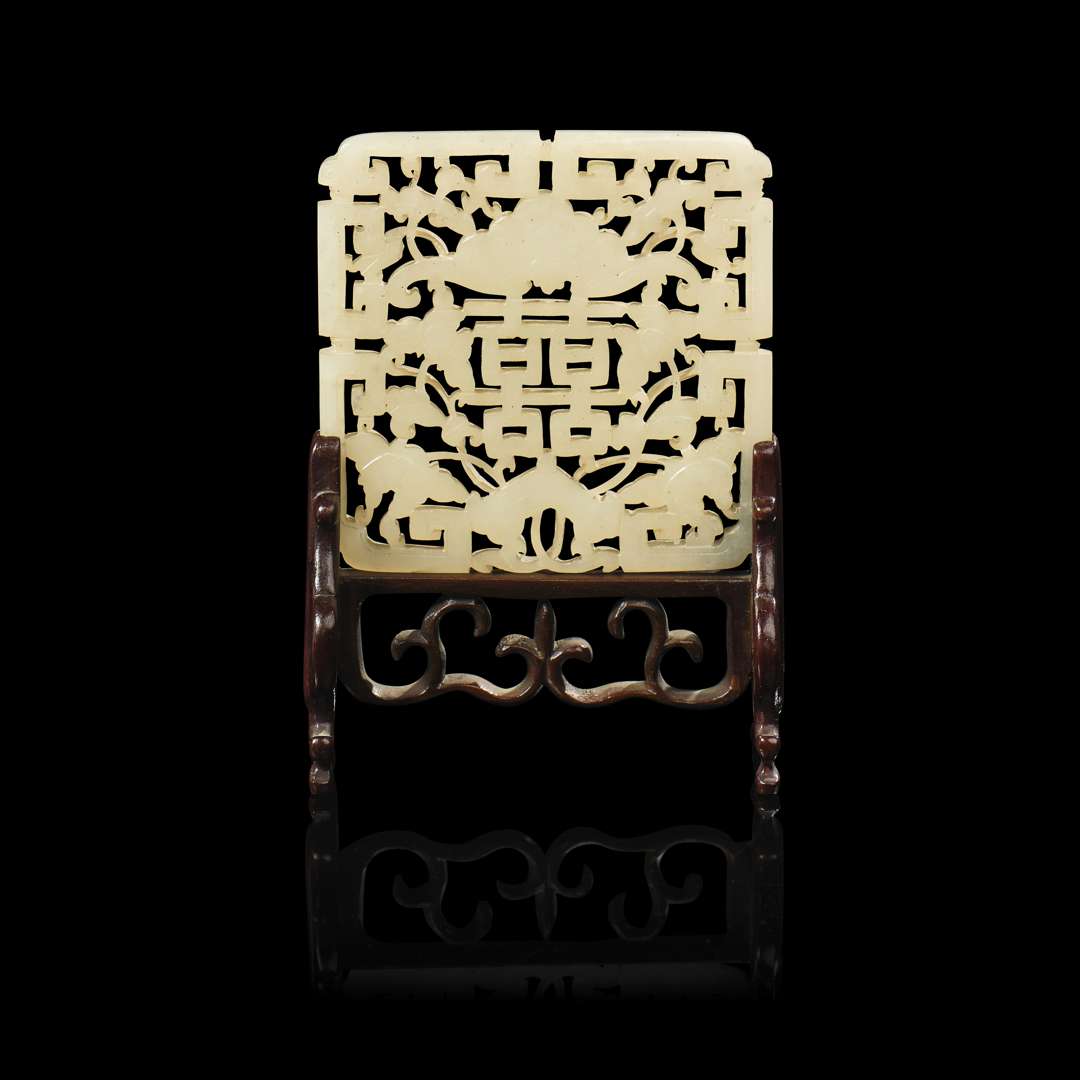 Plaque carrée en jade céladon pâle ajouré et réticulé à décor de caractère "Shuangxi", chauve-souris et rinceaux de lotus. Avec son socle en bois naturel sculpté postérieur.