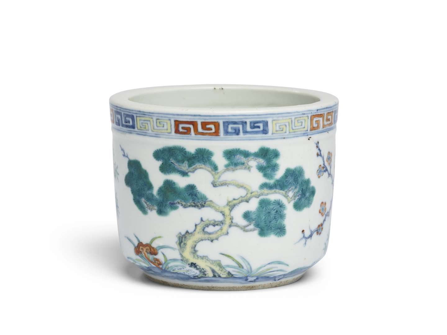 Petit brûle-parfum circulaire en porcelaine doucai à décor des "Trois Amis de l'Hiver". La lèvre soulignée par une frise de grecques. La base avec une marque Yu Ci Chun Yi Tang Zhi.