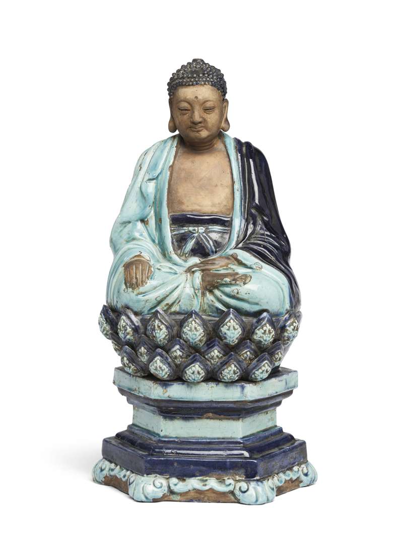 Statue de Bouddha en grès à couverte Fahua. Le bouddha assis en padmasana sur une base lotiforme aux pétales élaborés et reposant sur un haut piédestal hexagonal, la main droite en bhumiparshamudra, la main gauche reposant en dhyanamudra sur la jambe.