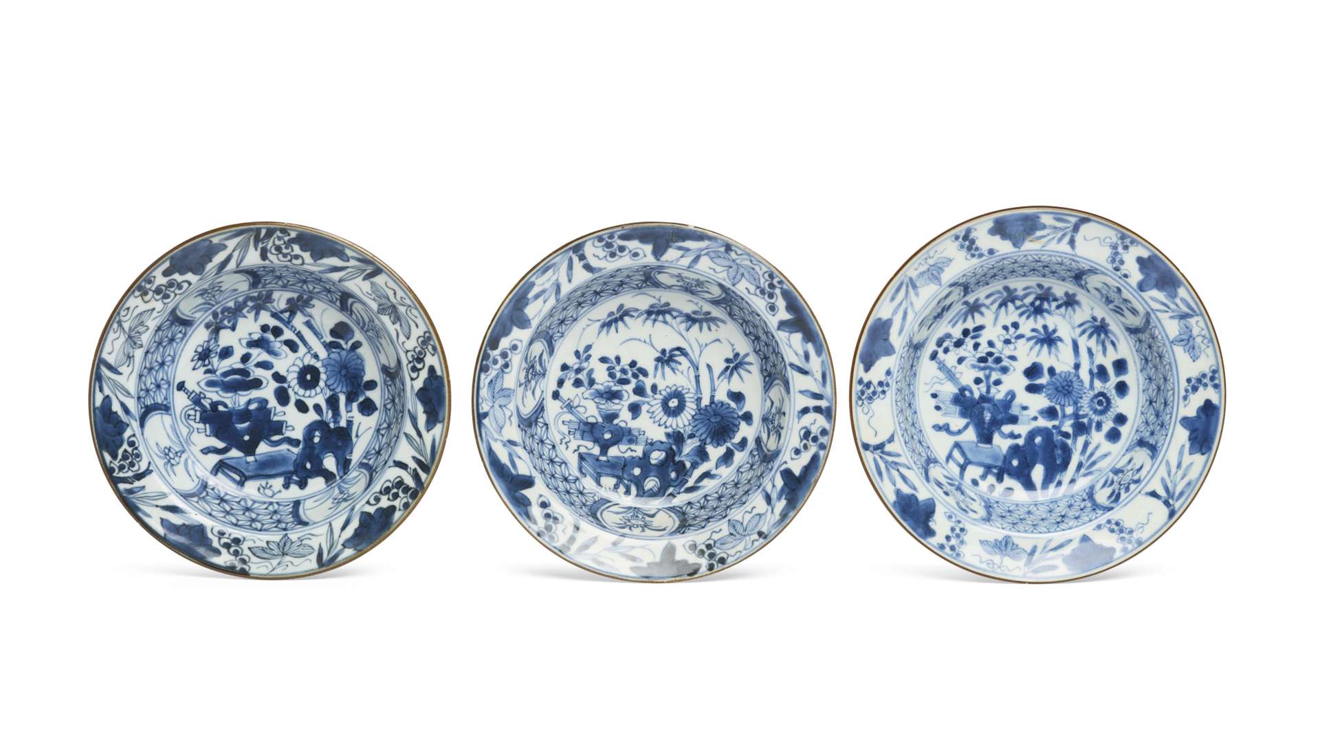 Ensemble de trois petits plats creux en porcelaine bleu-blanc de type "kraak" à décor de "Cent Antiques".