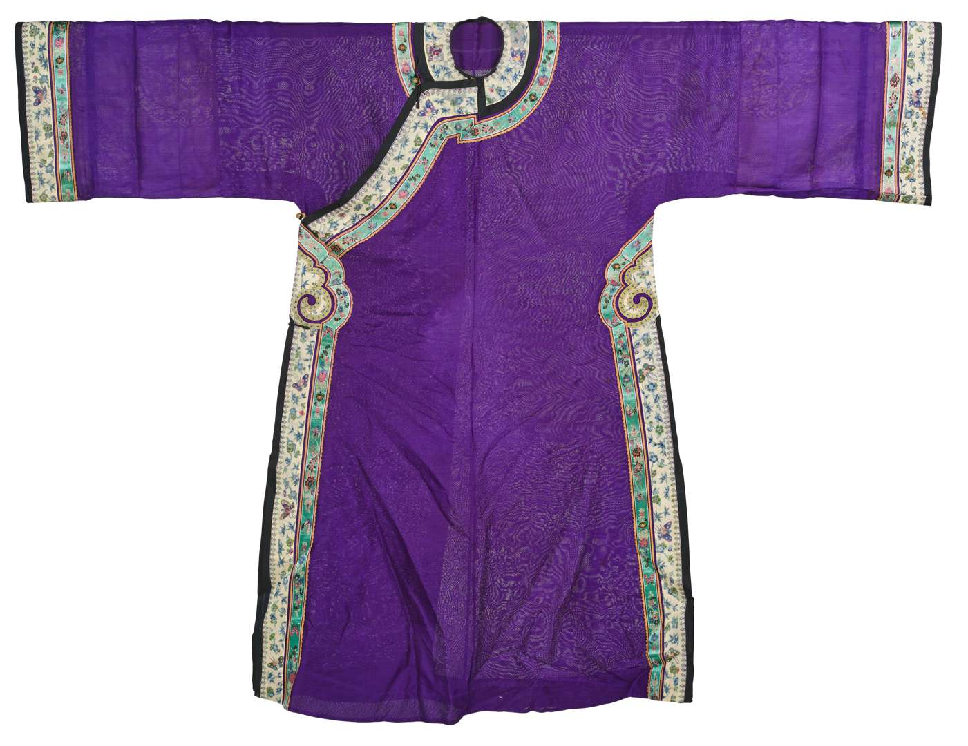 Robe d'été informelle changyi en gaze violet tissée de médaillons abritant des dragons pourchassant la perle parmi les flammes. Les manches doublées de toile crème brodée aux fils de soie polychromes de papillons et branches de prunus. Les bordures soulignées de toile crème brodée et galon vert d'eau à motif de fleurs.