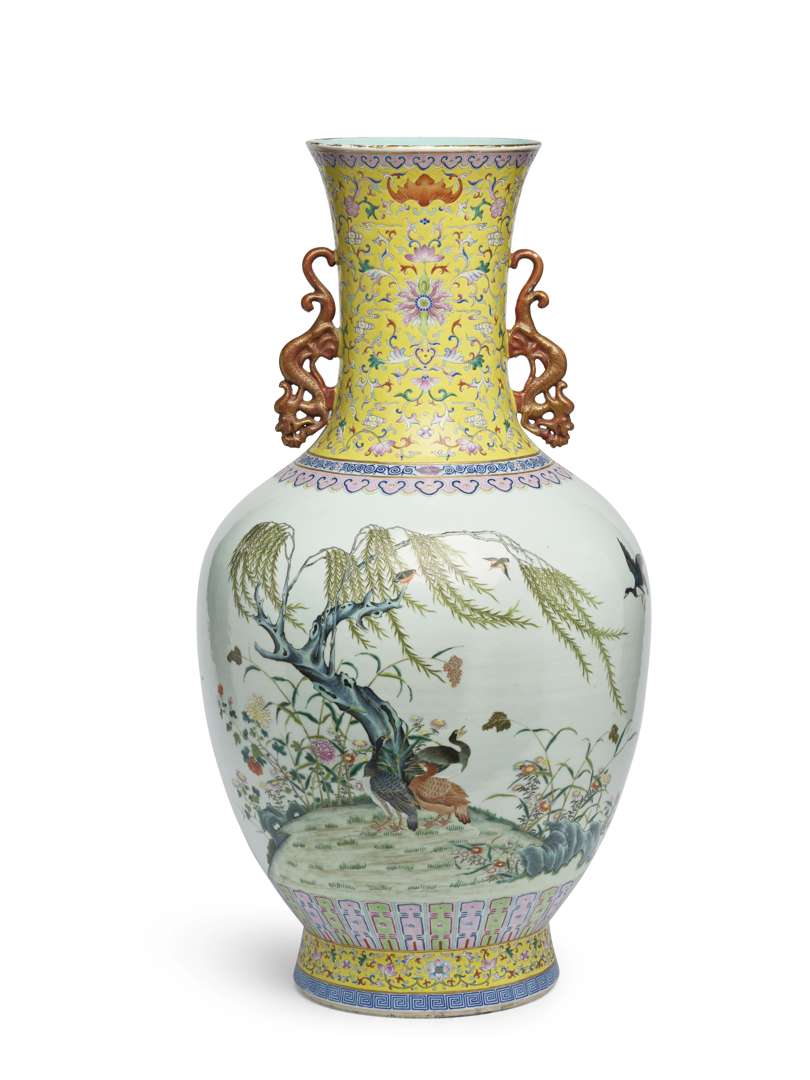 Important vase en porcelaine aux émaux polychromes à décor d'oies et de daims dans un paysage peuplés d'oiseaux et végétaux variés (saules, nandina, champignons lingzhi, chrysanthèmes, pivoines...). L'épaulement agrémenté d'un frise de ruyi. Le col évasé décoré de rinceaux feuillagés, fleurs de lotus et chauve-souris sur un fond émaillé jaune. Les anses émaillées en rouge-de-fer et or, imitant la forme de deux chilong. La base avec une marque Qianlong à six caractères en zhuanshu en bleu sous couverte sur fond turquoise.