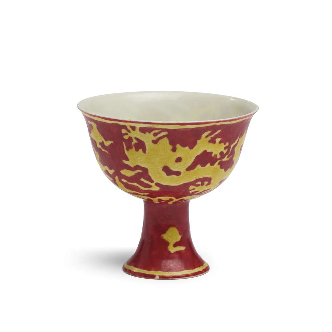 Coupe sur pied en porcelaine incisée de dragons impériaux pourchassant la perle parmi les nuées émaillés jaune et frise de pétales de lotus. L'ensemble se détachant sur un fond émaillé rouge. Une marque Chenghua à six caractères à l'intérieur du pied.