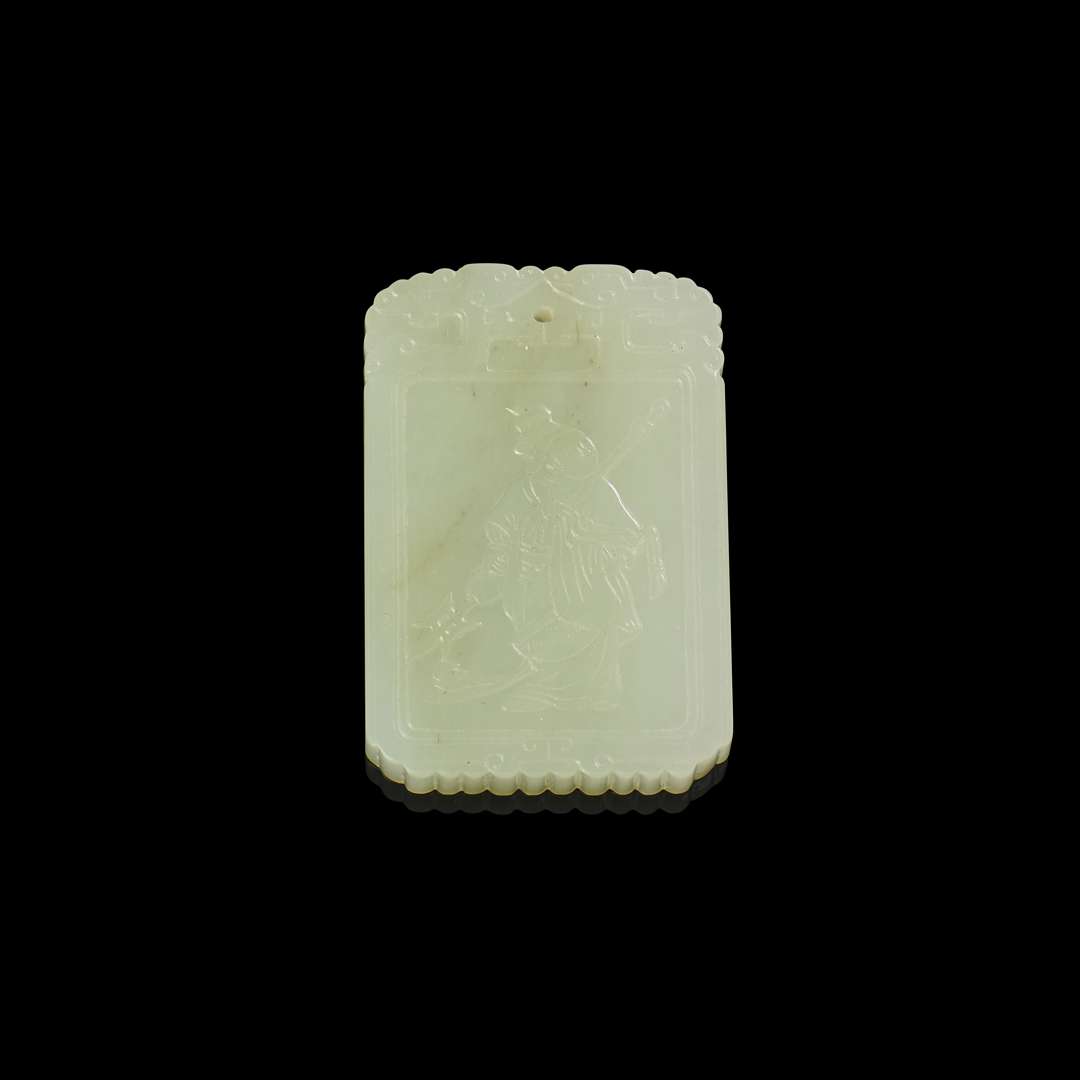 Plaque pendentif en jade céladon pâle sculptée figurant un guerrier tenant une hallebarde. Le revers avec un vers d'un poème et les sceaux "Wen" et "Wan".
