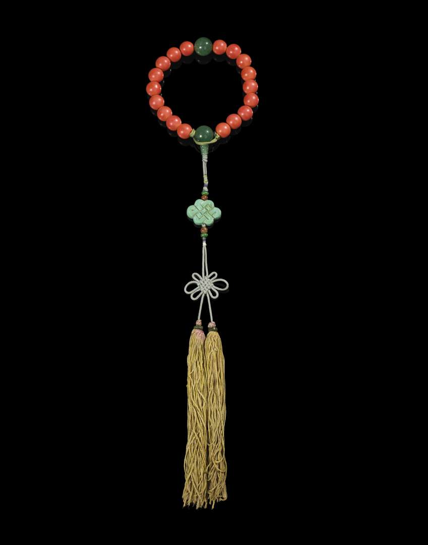 Rosaire bouddhique composé de dix-huit perles en verre à l'imitation du corail arrangées autour de deux perles en pierre dure verte, avec un pendant en forme de nœud infini en pâte de verre turquoise et pampilles.