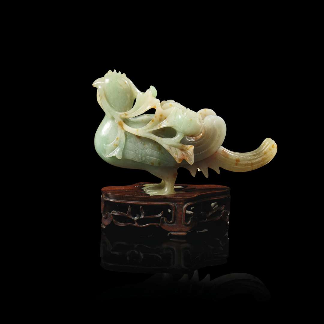 Statuette de phénix en jadéite sculpté, l'oiseau tenant une tige de pivoine dans le bec. Avec son socle en bois naturel sculpté.