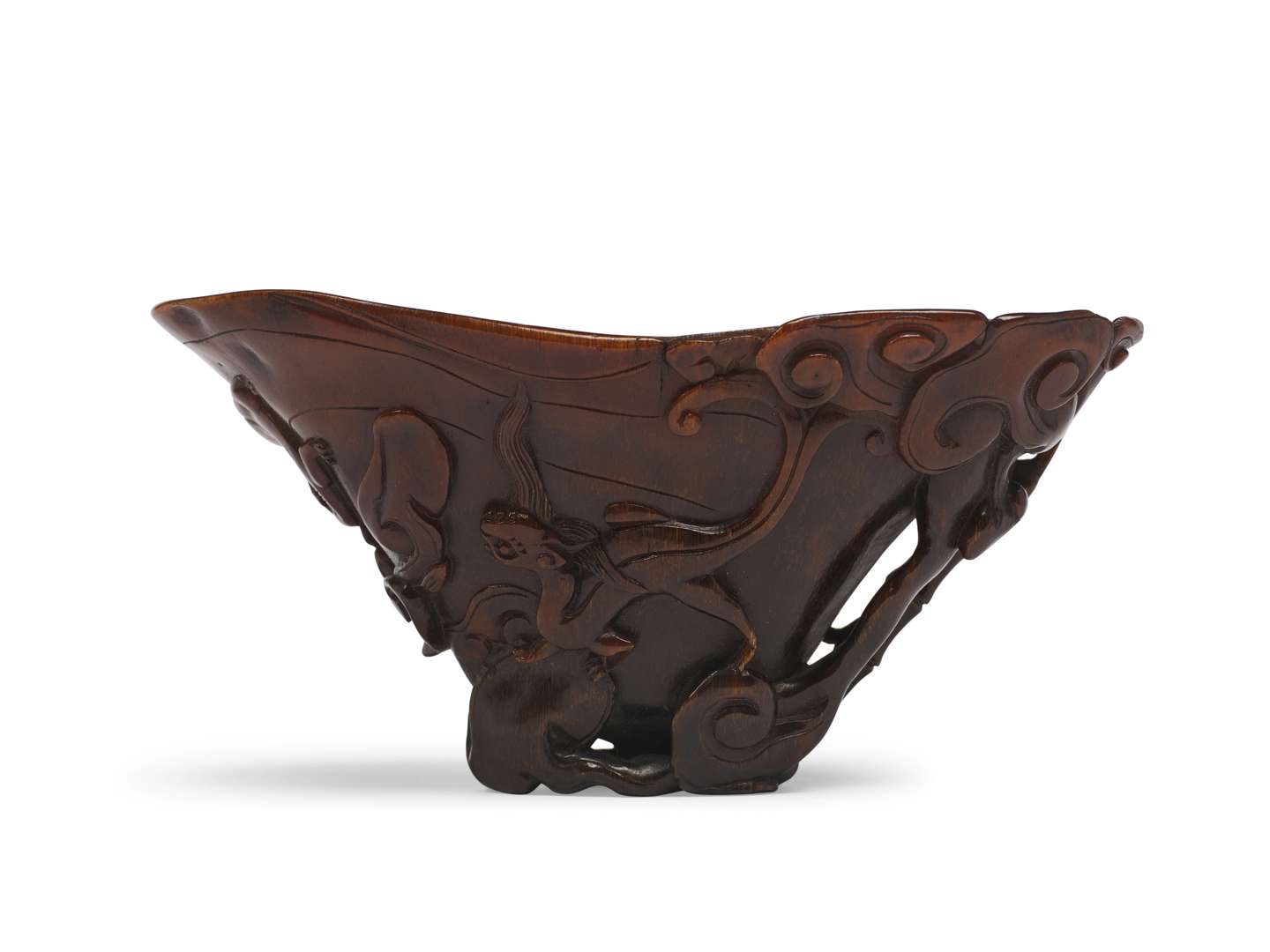 La matière, d’une rare densité et d’une patine chaude, est ici magnifiée par une taille fluide et minutieuse. La coupe adopte une forme naturelle, exploitant les courbes de la corne pour en révéler les qualités internes. Le décor extérieur en relief met en scène des chilong, dragons juvéniles sans corne, évoluant parmi des motifs de lingzhi, champignons de longévité. Le modelé dynamique des dragons et leurs mouvements souples s’associent aux courbes gracieuses des champignons, dans une composition équilibrée qui traduit une parfaite maîtrise de la technique et du sujet.