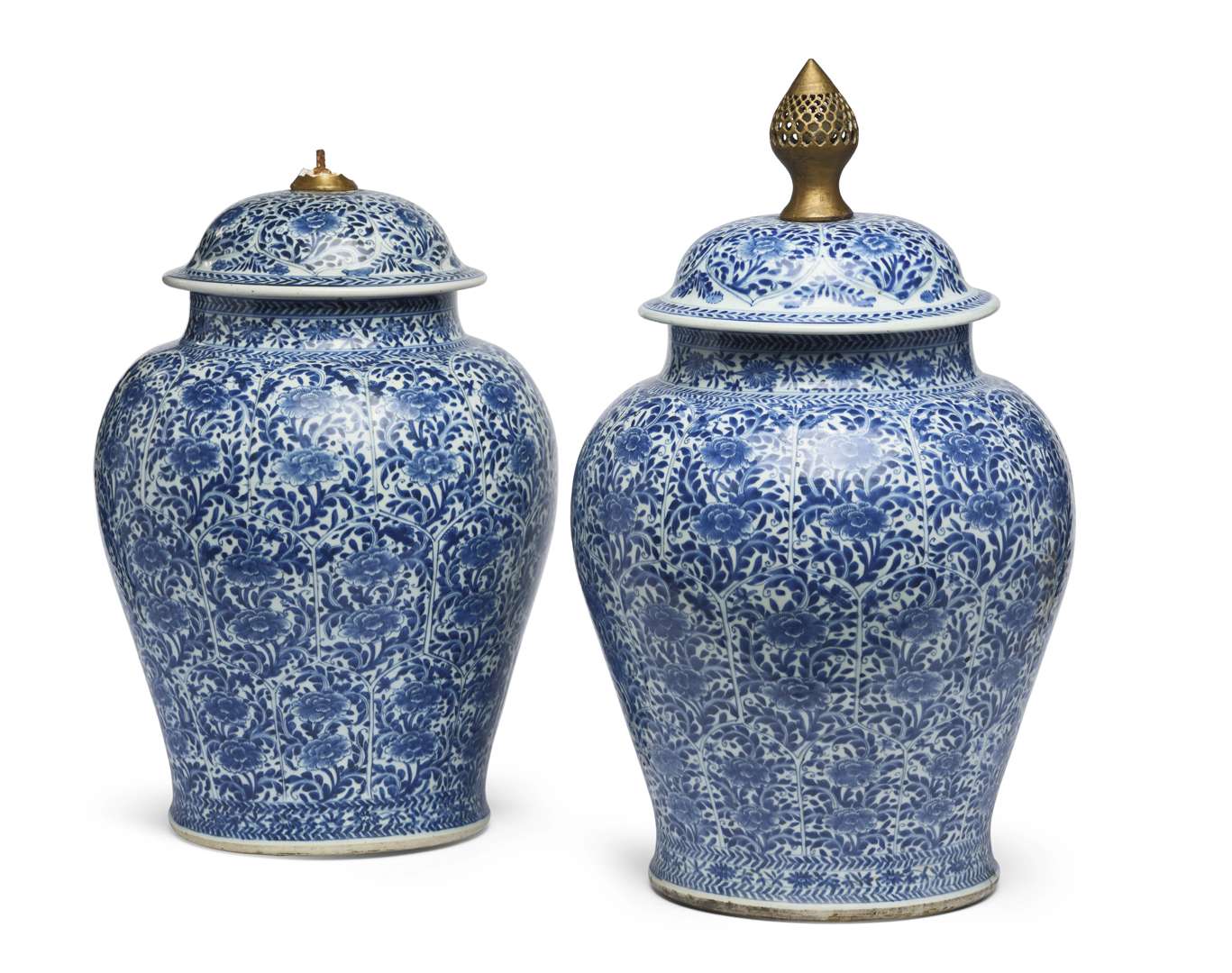 Paire d'importants vases balustres couverts en porcelaine moulée de pétales de lotus et décorées en bleu-blanc de fleurs et denses rinceaux.