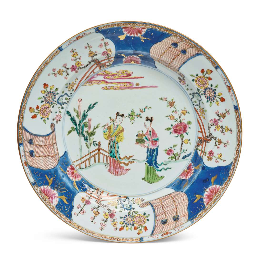Plat en porcelaine de la famille rose et Imari, le centre décoré une immortelle taoïste et son attendante. L'aile avec des réserves alternées figurant des stores ouvrant sur des vues de jardins.