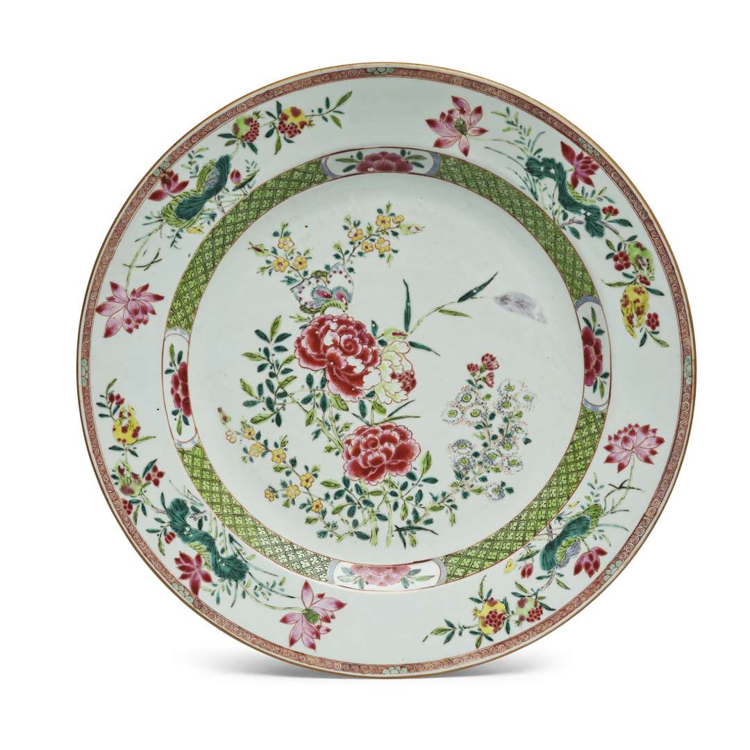 Important plat en porcelaine de la famille rose, le centre décoré d'un papillon parmi les pivoines et fleurs variées. L'aile ornée de feuilles et fleurs de lotus, citrons digités et grenades.