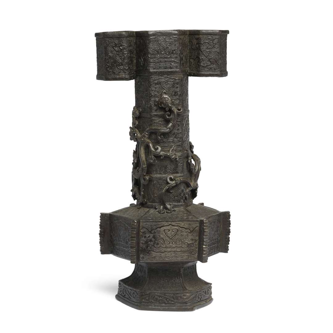 Important vase à flèches (touhu) hexagonal en bronze à patine brune, la panse de forme globulaire aplatie, le corps orné de masques de taotie et motifs archaïsants. Le col avec deux chilong en relief s'enroulant, les corps sineux et stylisés avec des têtes de ruyi.