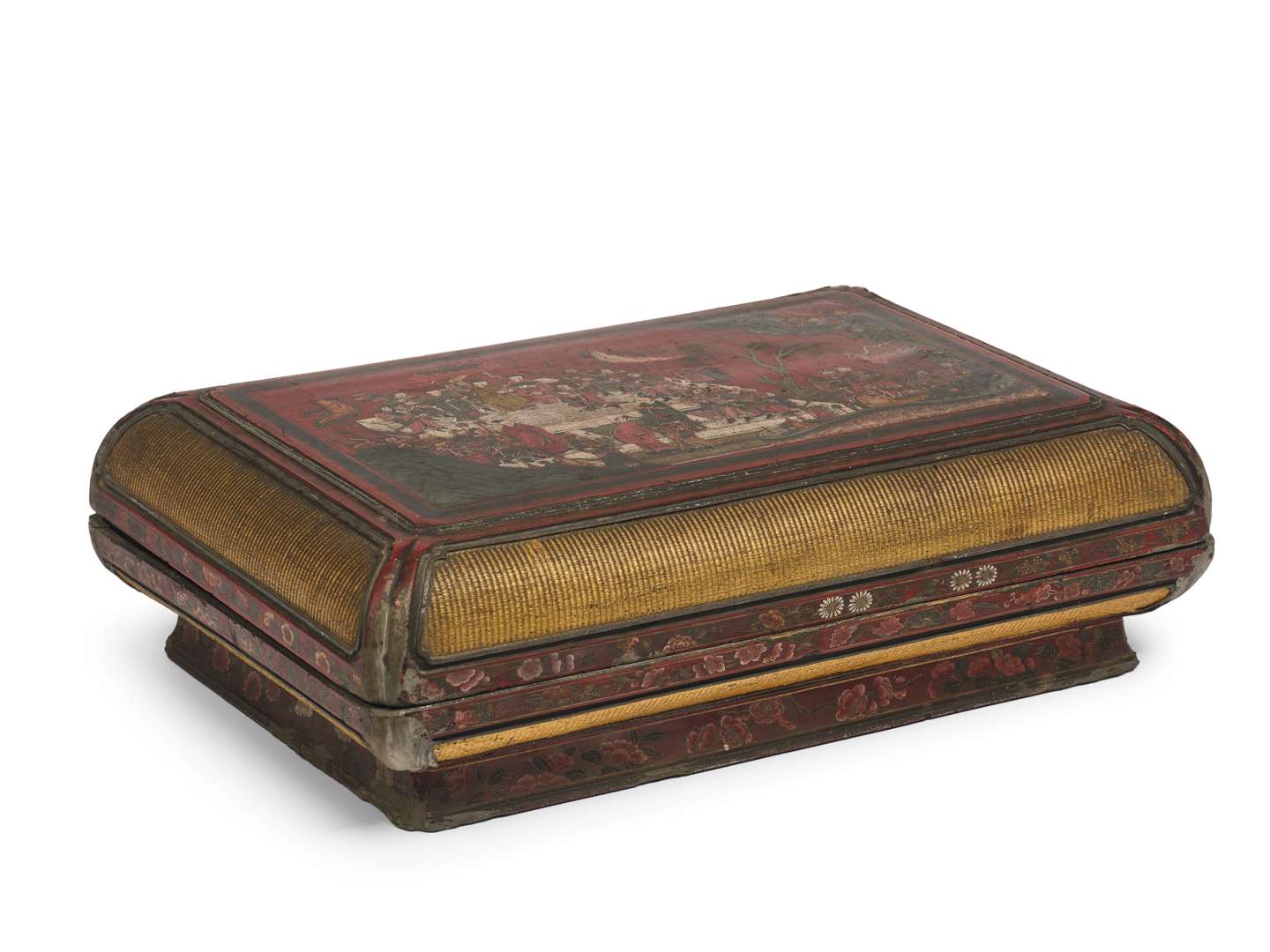 Grande boîte couverte rectangulaire en vannerie laquée doré et laque polychrome sur fond rouge. Le couvercle orné d'une scène d'hommages rassemblant de nombreux immortels, guerriers et dignitaires célestes. L'ensemble complété par de larges bandes de vannerie dorée et des frises de fleurettes peintes. L'intérieur de la boîte et du couvercle richement décorés de lotus, prunus, œillets, camélia, pivoines, orchidées en laque polychrome et rehauts d'or sur fond rouge.