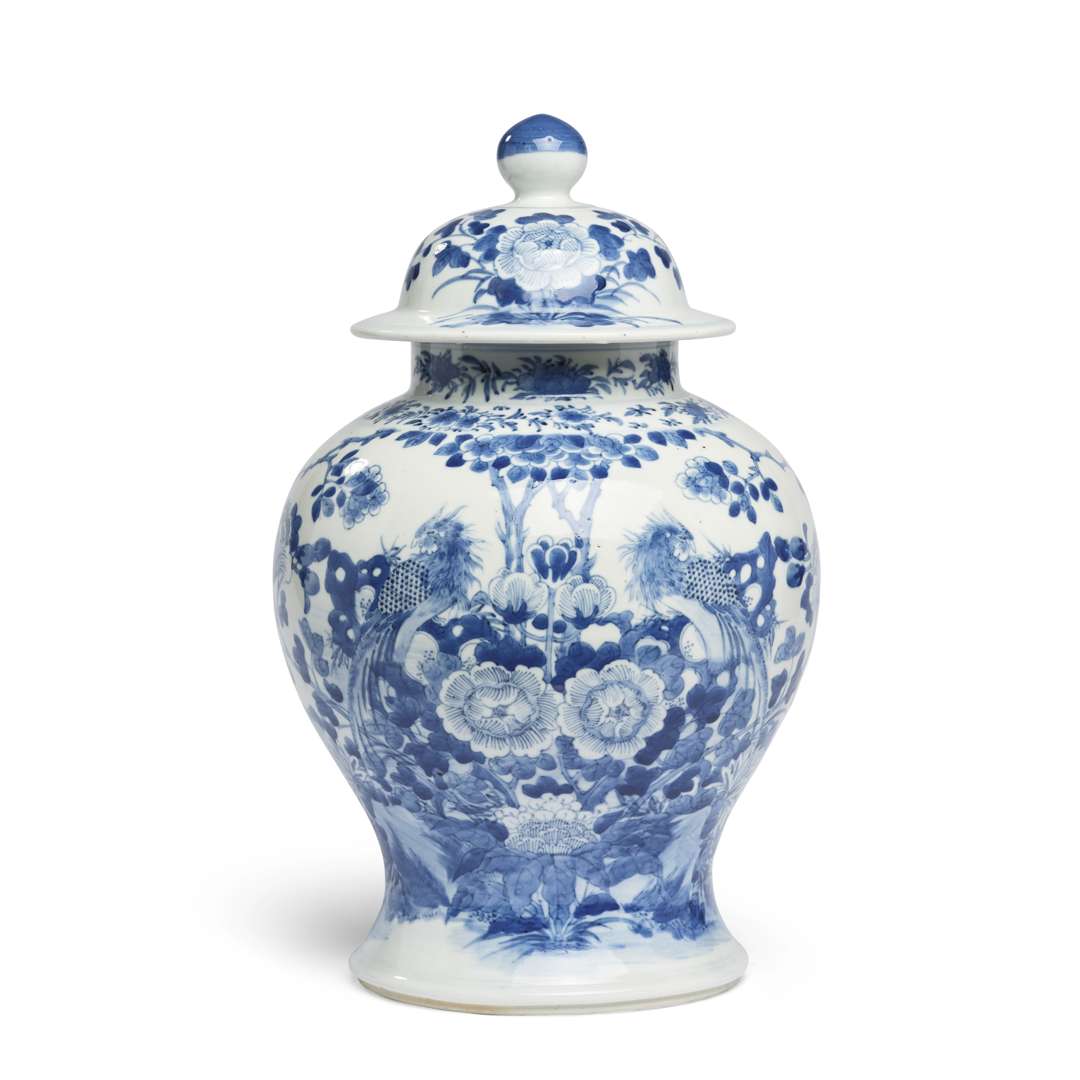 Vase balustre couvert en porcelaine bleu-blanc à décor d'un couple de phénix parmi les pivoines et les rochers.
