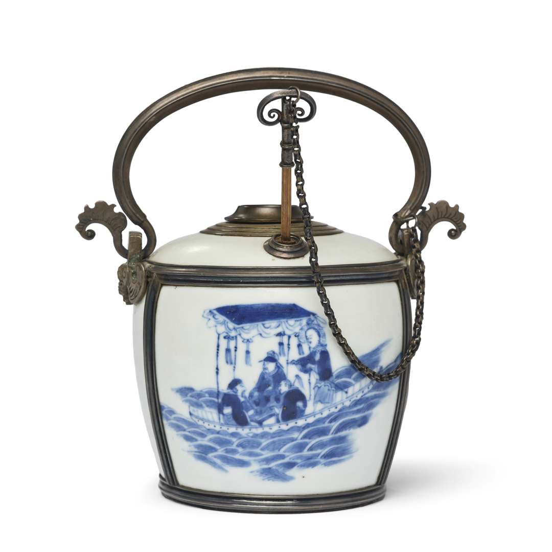 Pipe-à-eau en porcelaine bleu-blanc figurant l'excursion de Su Shi à la Falaise Rouge. La monture en paktong à décor de chauve-souris. La base avec une marque au caractère Tho ("Longévité").