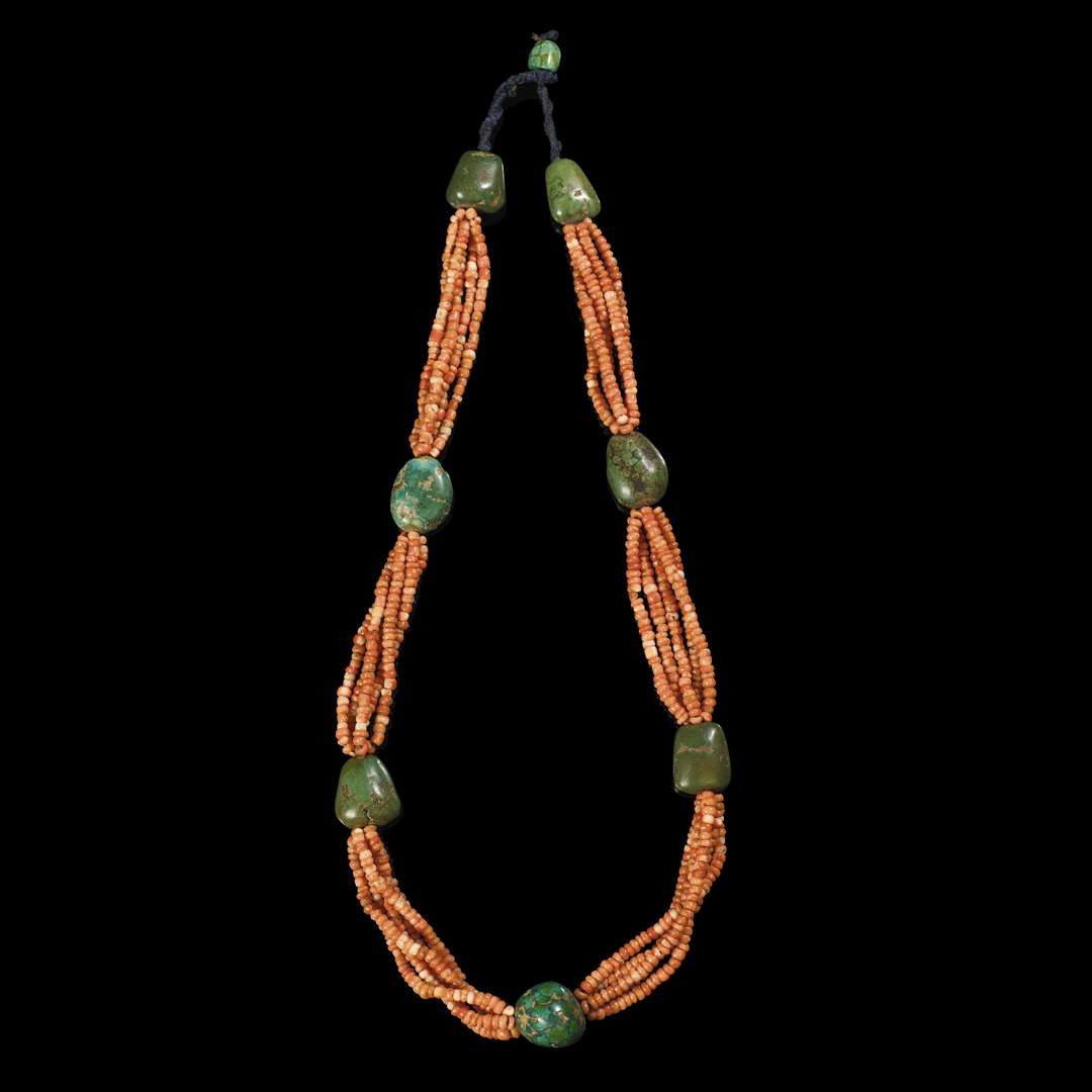 Long collier composé plusieurs rangs de petites perles de corail “peau d'ange" alternant avec des galets de turquoises.