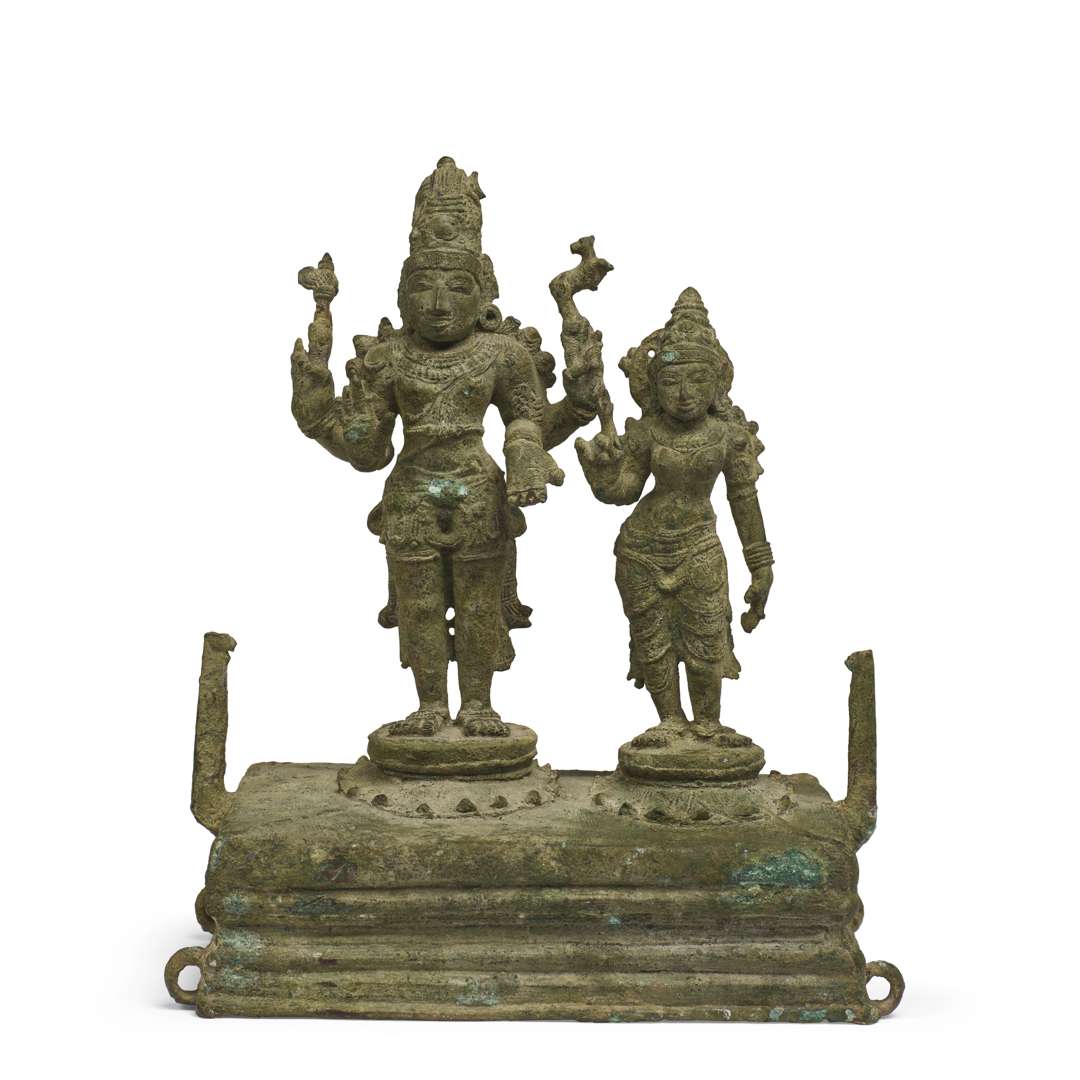 Groupe en bronze figurant Shiva et Parvati, parés de nombreux bijoux, debout sur des bases circulaires ornées de pétales de lotus stylisés. Shiva, tenant une massue dans la main gauche, et une effigie de son vahana, le taureau Nandi. Ses deux autres mains en abhayamudra et varadamudra. La déesse Parvati, également debout en léger tribhanga, tenant une fleur de lotus. L'ensemble sur une large base rectangulaire.