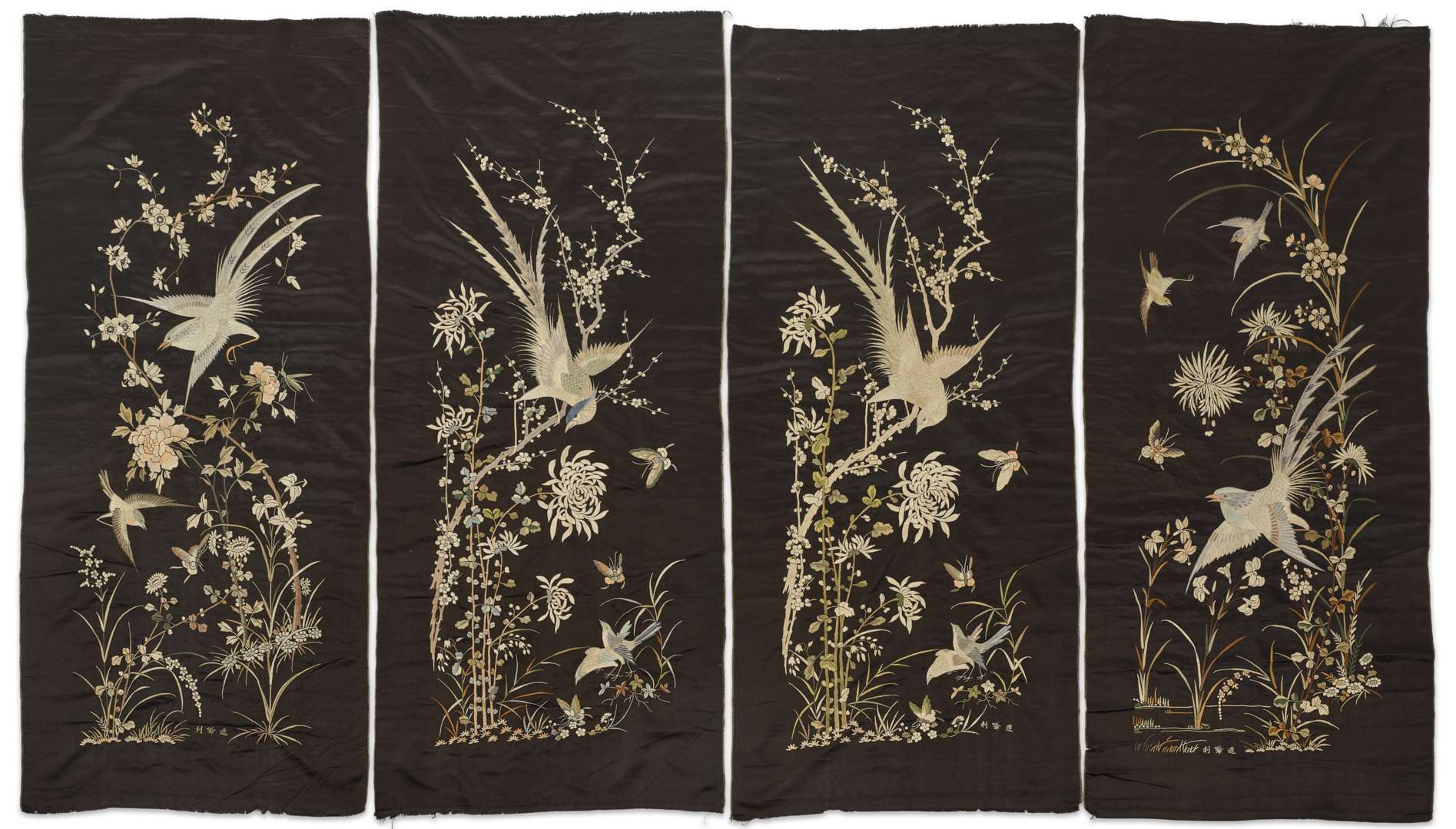 Ensemble de quatre panneaux en satin à fond brun sombre brodés d'oiseaux et d'insectes parmi les fleurs (prunus, chrysanthèmes, oeillets…)