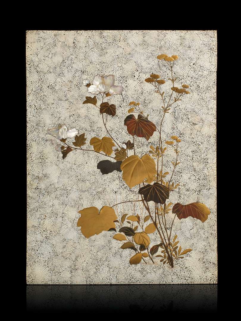 Paire de panneaux en laque d'or et d'argent hiramaki-e, takamaki-e et incrustations de nacre sur fond rankaku (coquille d'œuf). L'un figurant des lespédèzes et des bégonias en fleur, l'autre des hibiscus et des ombellifères.