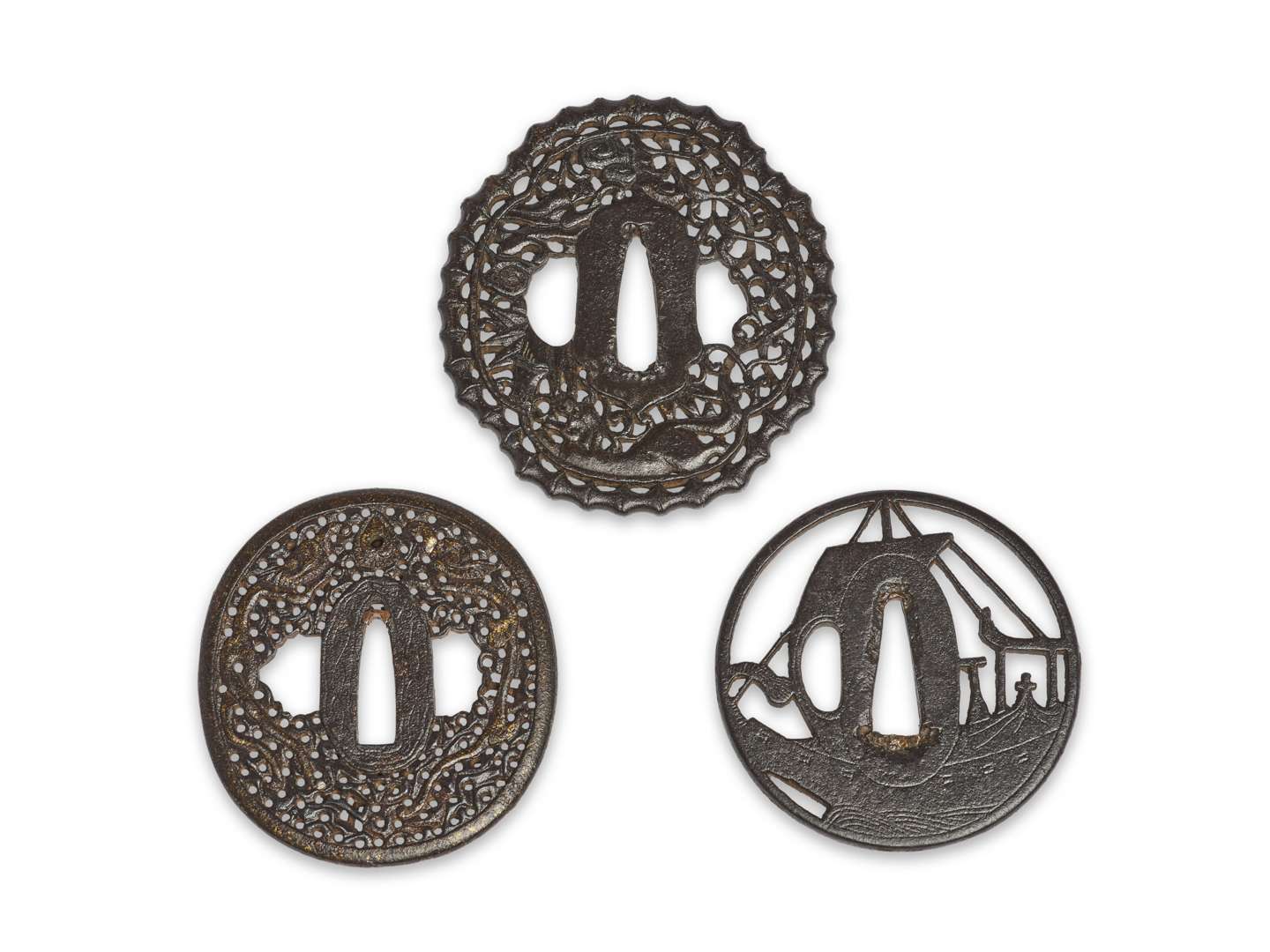Ensemble de trois tsubas en fer, une nagamaru-gata de style namban à décor ajouré en maru bori de chilong pourchassant un joyau parmi les rinceaux ; une mokko-gata à décor ajouré en maru-bori d'un tigre parmi les bambous, nuées et karakusa ; une maru-gata à décor ajouré en yo-sukashi d'un motif kazeho.