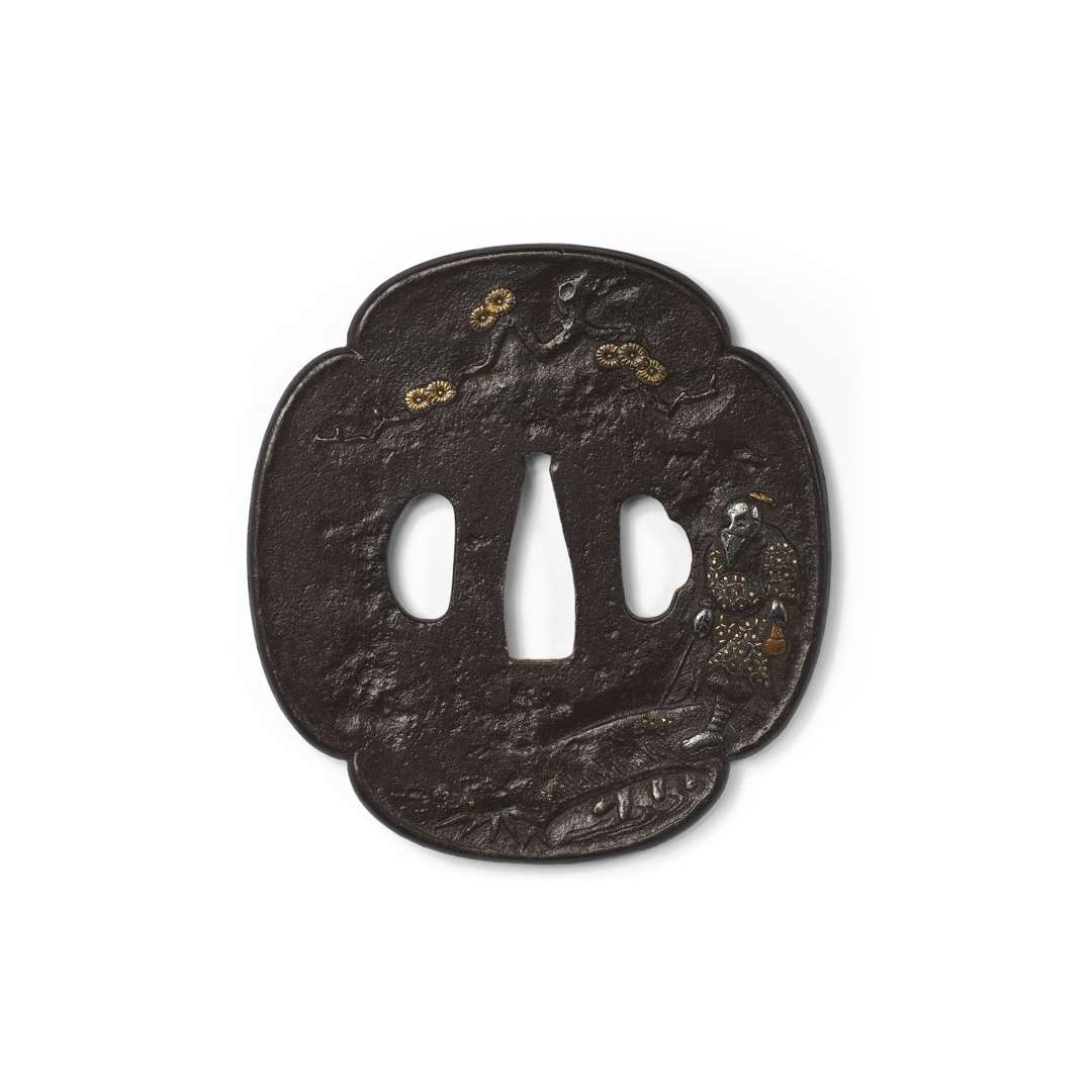Tsuba mokko gata à décor en iroe takazogan incrusté d'or et sentoku d'un vieil homme traversant un pont sous un pin