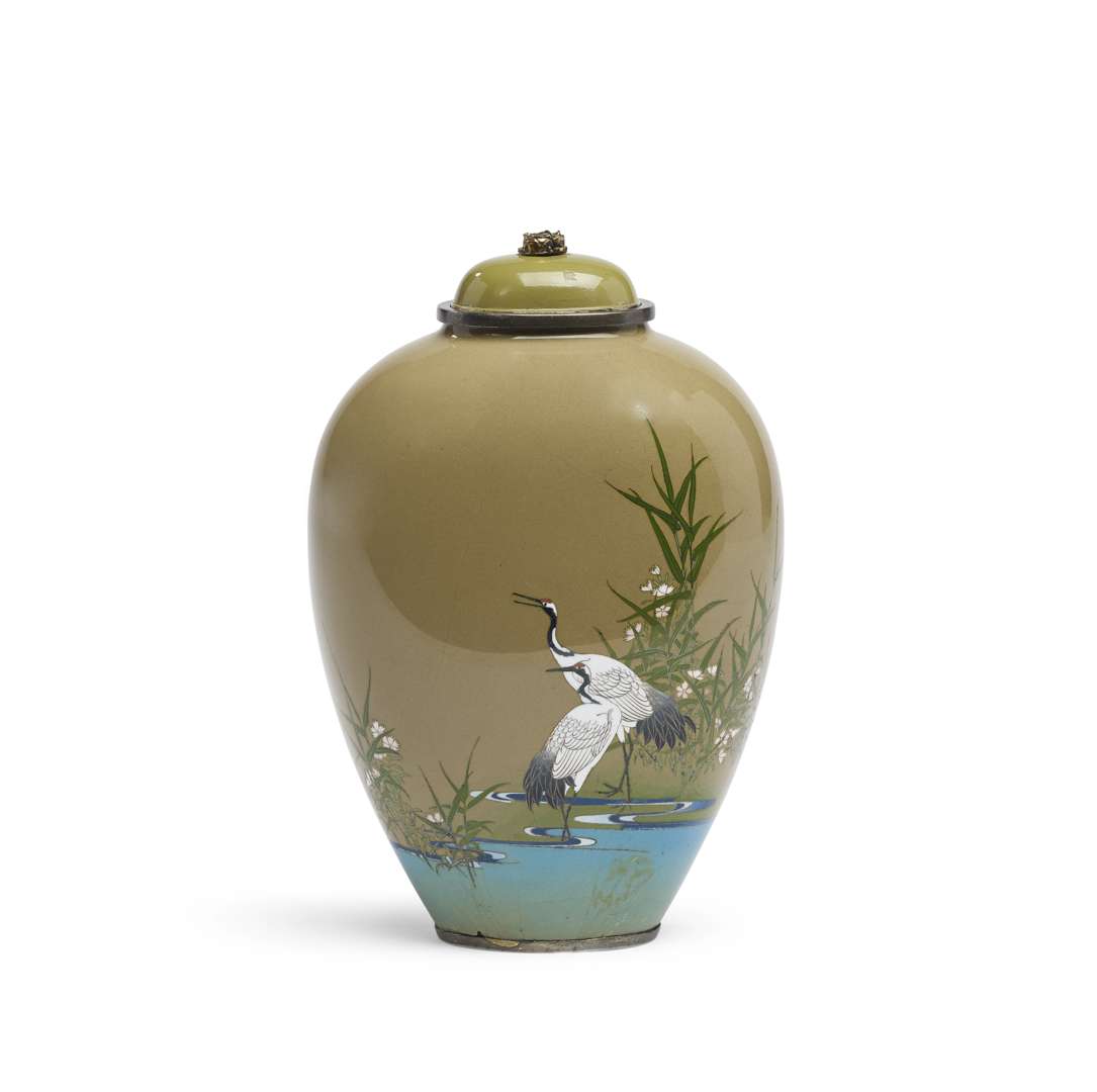 Petite jarre couverte en émaux cloisonnés orné de deux grues dans une rivière parmi les oeillets (nadeshiko). Le revers avec deux oiseaux bleu en vol. L'ensemble se détachant sur un fond émaillé vert olive. La lèvre et la base en argent. La base signée avec les caractères gravés "Kyoto Namikawa".