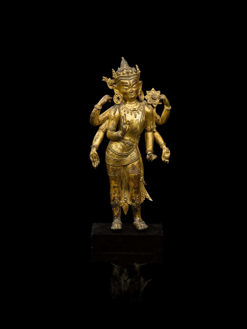 Importante statue de bodhisattva à six bras en alliage cuivreux doré, figuré debout en léger tribhanga, vêtu d'un fin dhoti noué sur la hanche aux pans retombant gracieusement, paré de nombreux bijoux ouvragés (brassards, bracelets, ceinture, colliers…). Sa main droite principale en abhayamudra, tandis que sa main principale gauche tient une tige de lotus s'épanouissant sur l'épaule. Une des mains gauche tenant une kundika. Le visage aux yeux étirés encadrés par deux larges boucles d'oreilles rondes, le front ceint d'une couronne à cinq fleurons et rubans flottants. La face inférieur de chaque pied avec un tenon. Sur un socle en plexiglas postérieur.