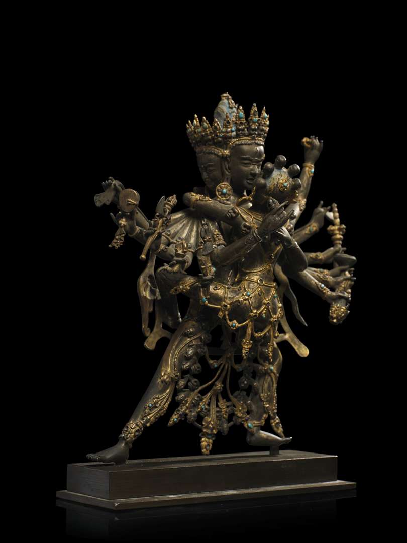 Importante statue de Chakrasamvara en bronze doré, figuré debout en alidhasana, enlançant en yabyum sa parèdre Vajravarahi, ses douze bras disposés en éventail autour de son corps et tenant des attributs variés (damaru, hache, kartika, trident, vajra, khatvanga, kapala, corde, tête de Brahma et gantha). Le yidam et sa parèdre sont parés de nombreux bijoux rehaussés d'incrustations de pierres dures (brassards, bracelets, boucles d'oreilles) et vêtus de fins tabliers formant une résille et rehaussés de pendeloques. Chakrasamvara est également vêtu d'un peau d'éléphant et de ceintures de crânes et têtes coupées délicatement ciselés. Ses quatre visages sont couronnés d'un fin diadème à fleurons et masques de citipati. Les corps de Chakrasamvara et Vajravarahi avec leurs charges rituelles. La face inférieur de chaque pied avec un tenon. Sur un socle en métal postérieur.