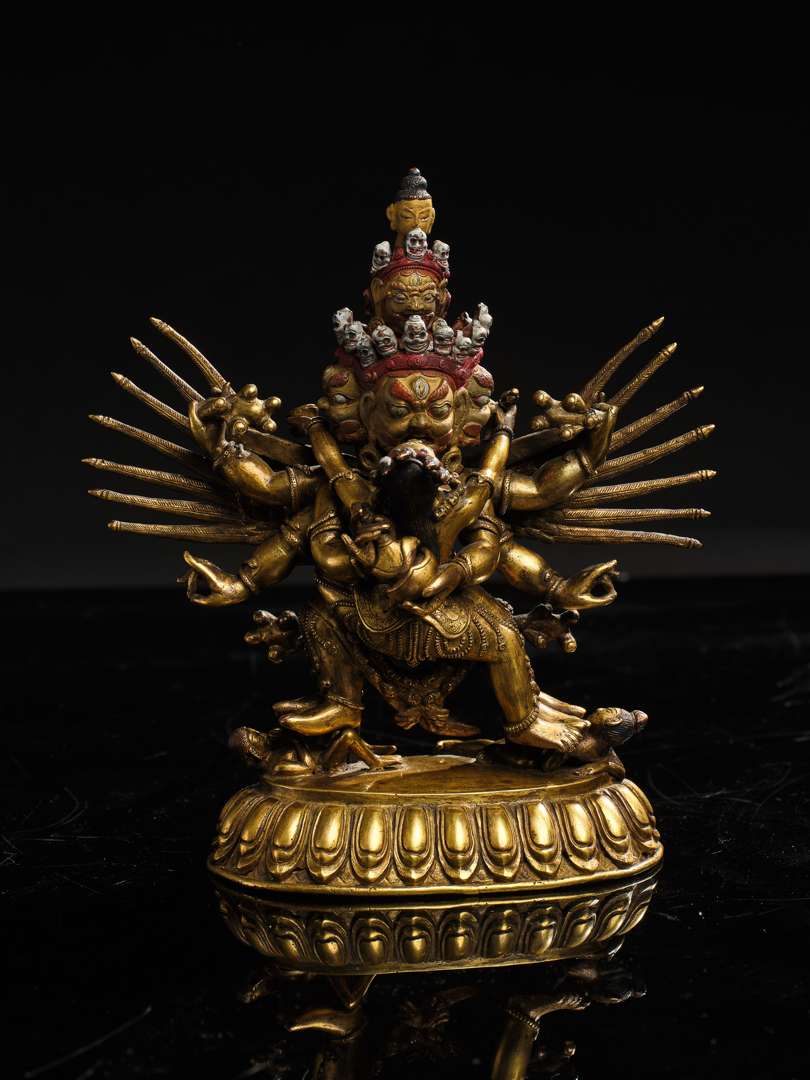 Statue d'un Heruka ailé en bronze doré, en alidhasana sur deux personnages prosterné et reposant sur une base lotiforme. Le yidam à quatre jambes, six bras et cinq têtes figuré en yabyum avec sa parèdre, chacun tenant un kartika et un kapala. Les deux mains secondaires inférieures en shuni mudra et les deux mains supérieures tenant une peau de tigre. La base scellée incisée d'un double-vajra.