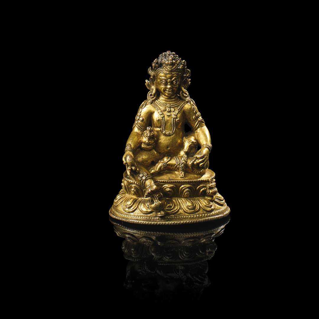 Statuette de Jambhala jaune (Zho Dzambhala) en bronze doré, figuré assis en lalitasana sur une double base lotiforme, son pied droit s'appuyant sur un vase kalasha. Il présente de la main gauche un fruit bijapuraka, tandis qu'il tient un rosaire de la main droite. Sur sa cuisse droite repose un vase kalasha, et il est accompagné d'une mangouste (nakula) crachant des joyaux. L'arrière de la base avec un autre vase kalasha sculpté. La base scellée gravée d'un lotus stylisé.