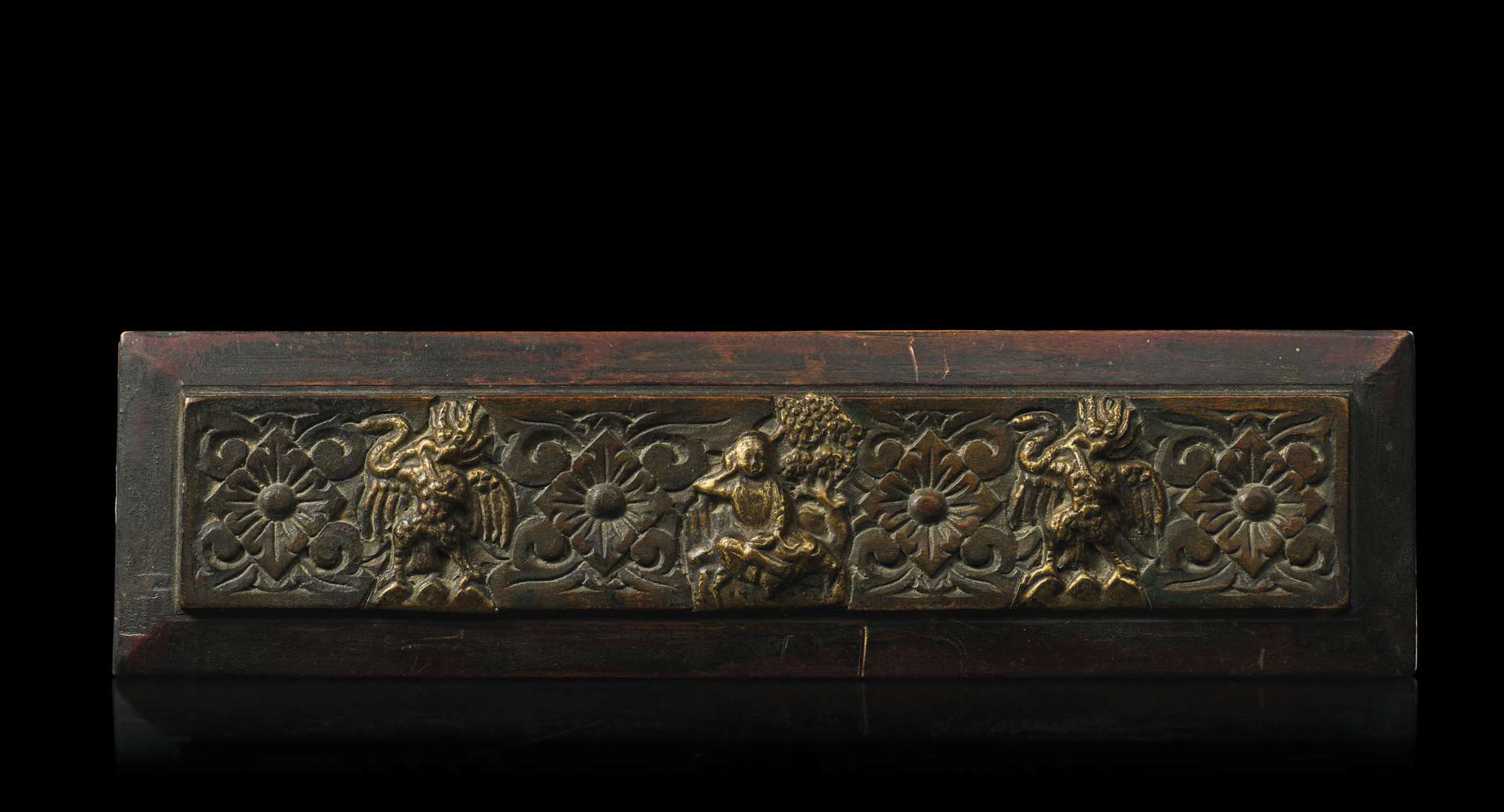 Petit livre de prières bouddhiste comprenant dix feuilles polychromées. Les plats de reliure en bois sculpté de fleurs et rinceaux, avec des plaques en cuivre repoussé doré figurant Milarepa et deux Garuda. Le revers incrusté d'un triple joyau flammé et deux doubles vajra.
