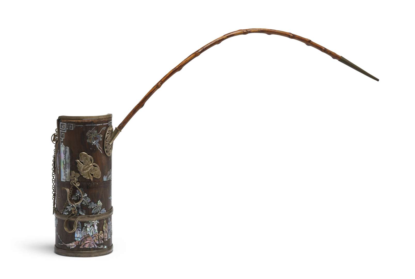 Pipe-à-eau en bois naturel et incrustations de nacre décoré de personnages dans un jardin et d'une calligraphie. L'ensemble rehaussé d'un monture en paktong.