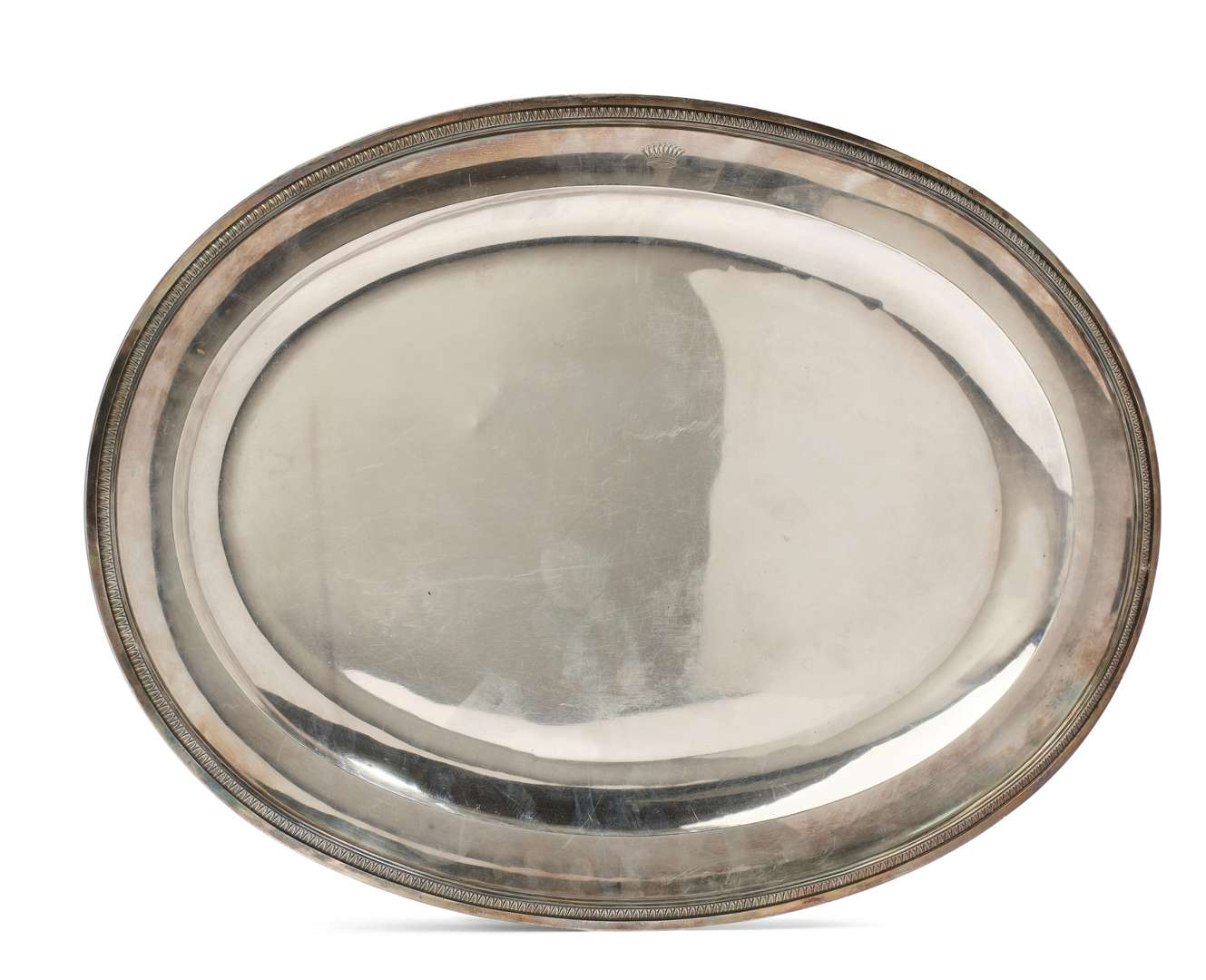 Plat en argent de forme ovale, la bordure ornée d'une frise de feuilles d'eau. L'aile gravée d'une couronne comtale.