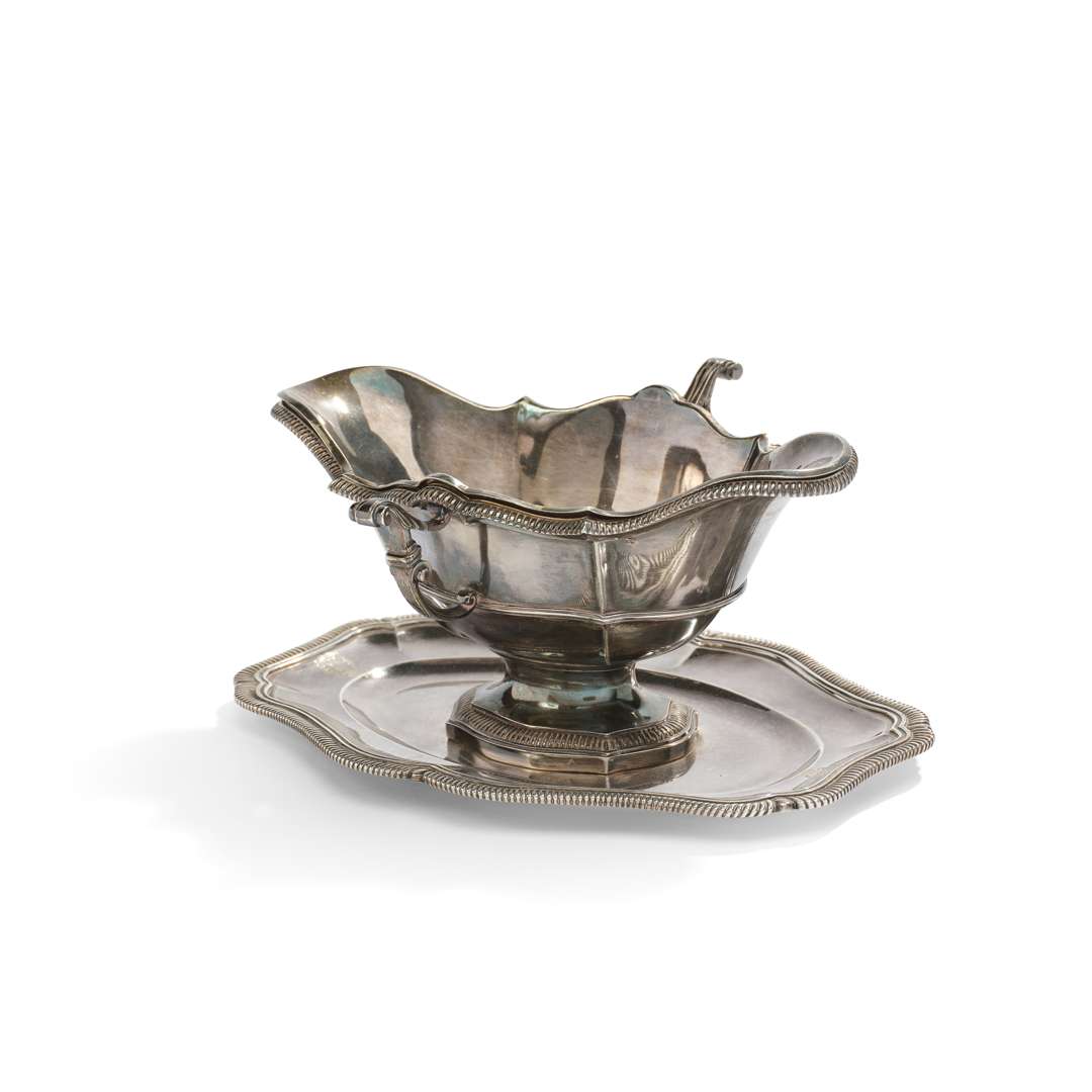 Saucière et sa doublure en argent, de forme chantournée et aux bordures ornées de frises de godrons et soulignées de filets.