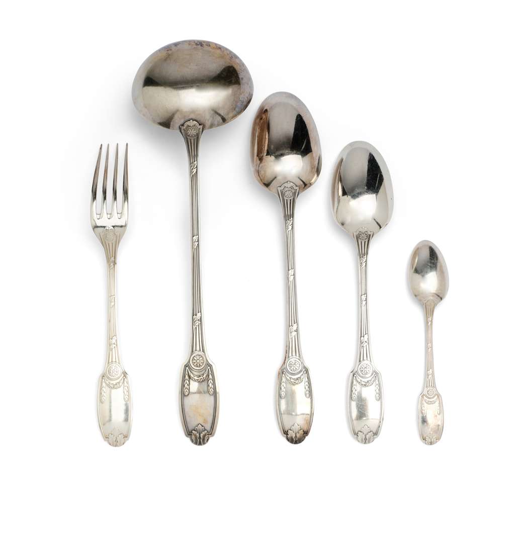 Partie de ménagère en métal argenté, modèle Louis XVI Feuille Marie-Antoinette, comprenant /