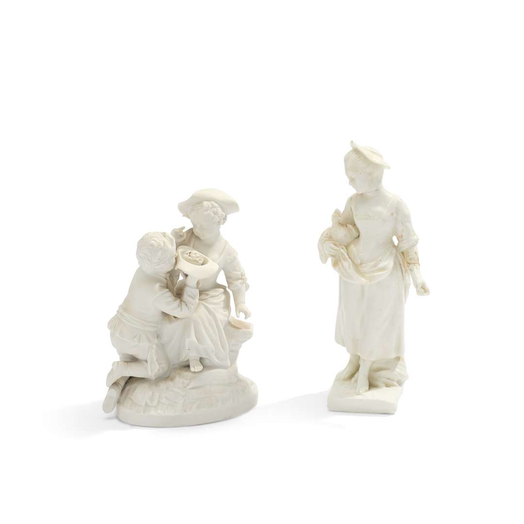 en porcelaine blanche représentant respectivement un groupe aux enfants amoureux au coq et une jeune fille.