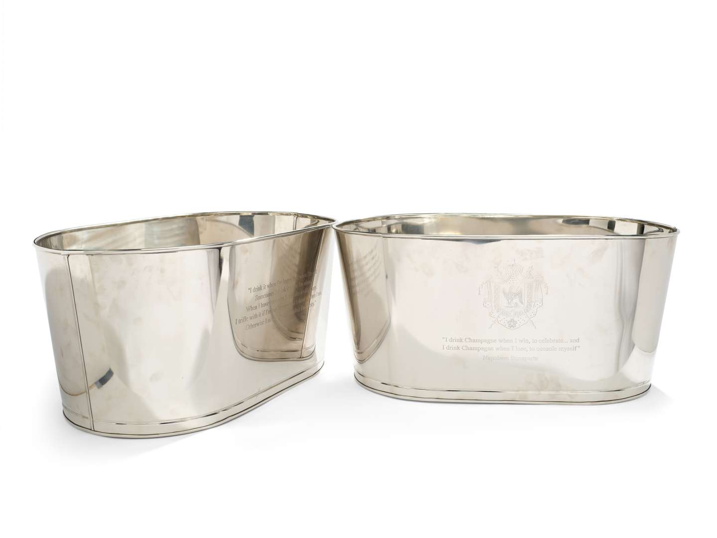 de forme ovales en inox. Les panses gravée sur chaque d'une citation de Lily Bollinger et de Napoléon Bonaparte, relatives au champagne.