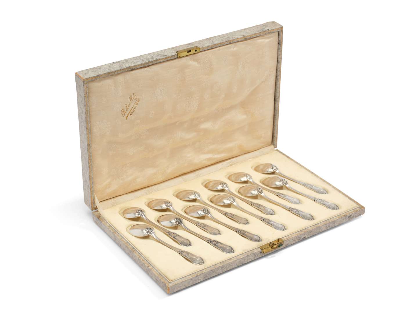 en argent. Les manches à décor de guirlandes et fleurons, les spatules monogrammées LC.